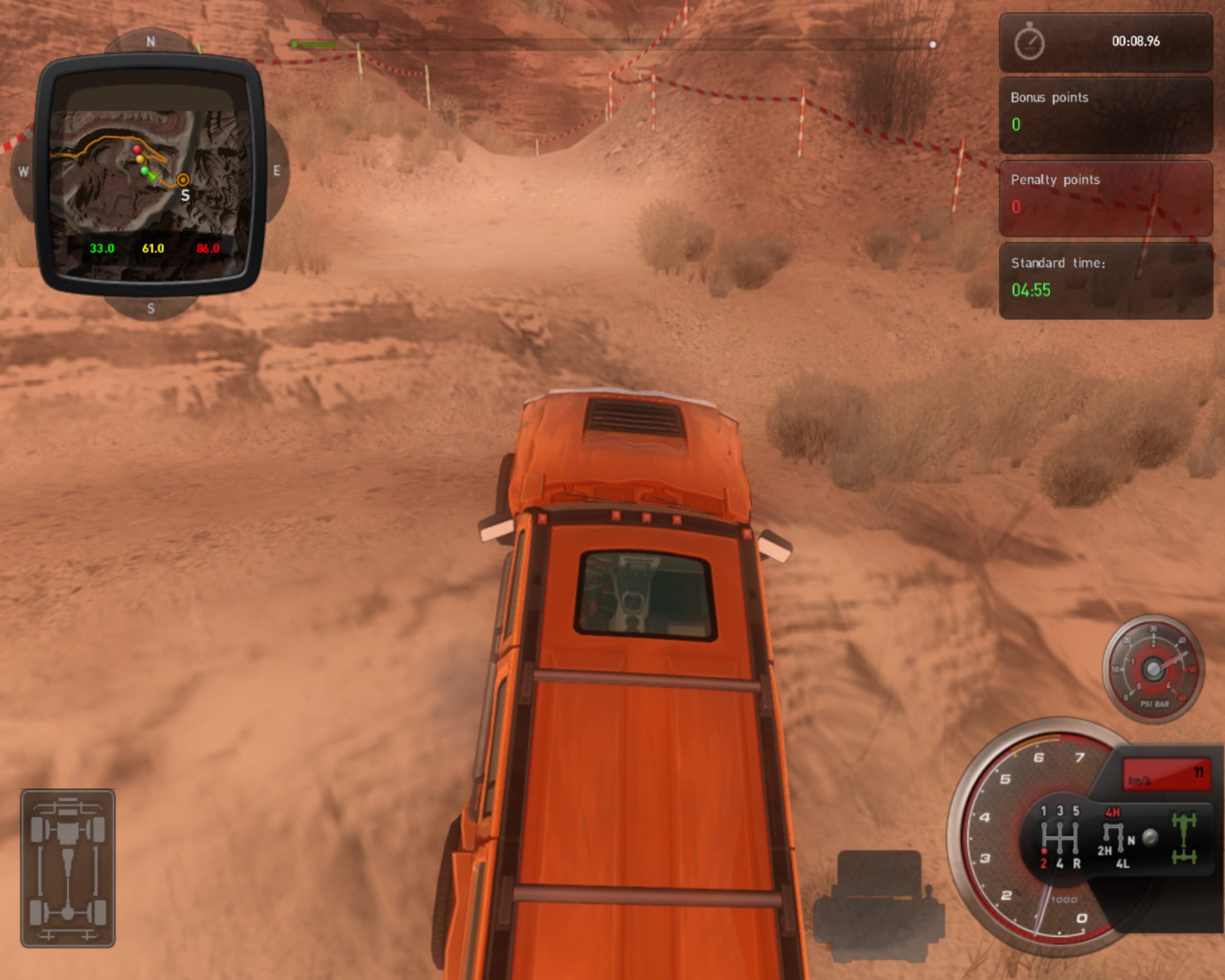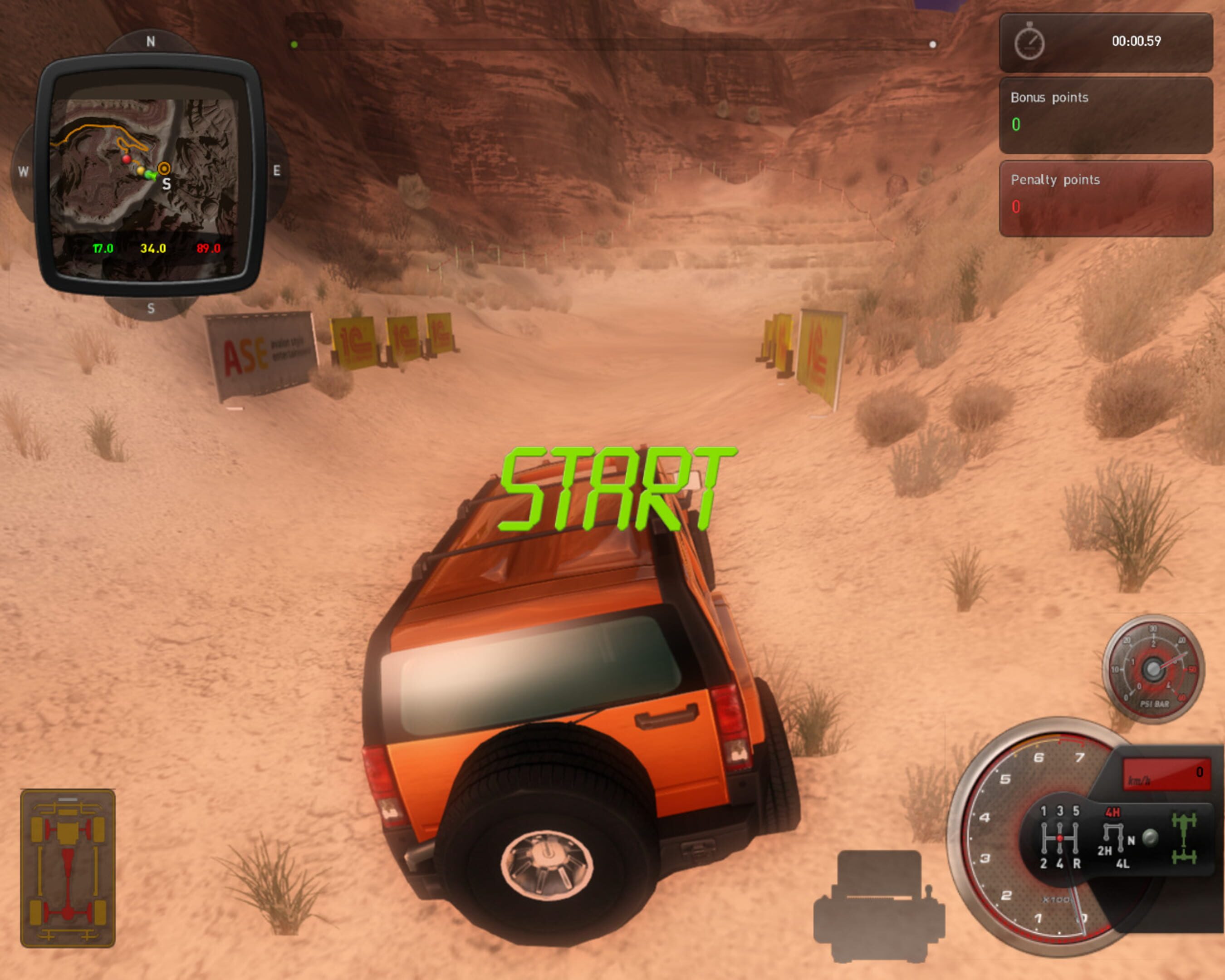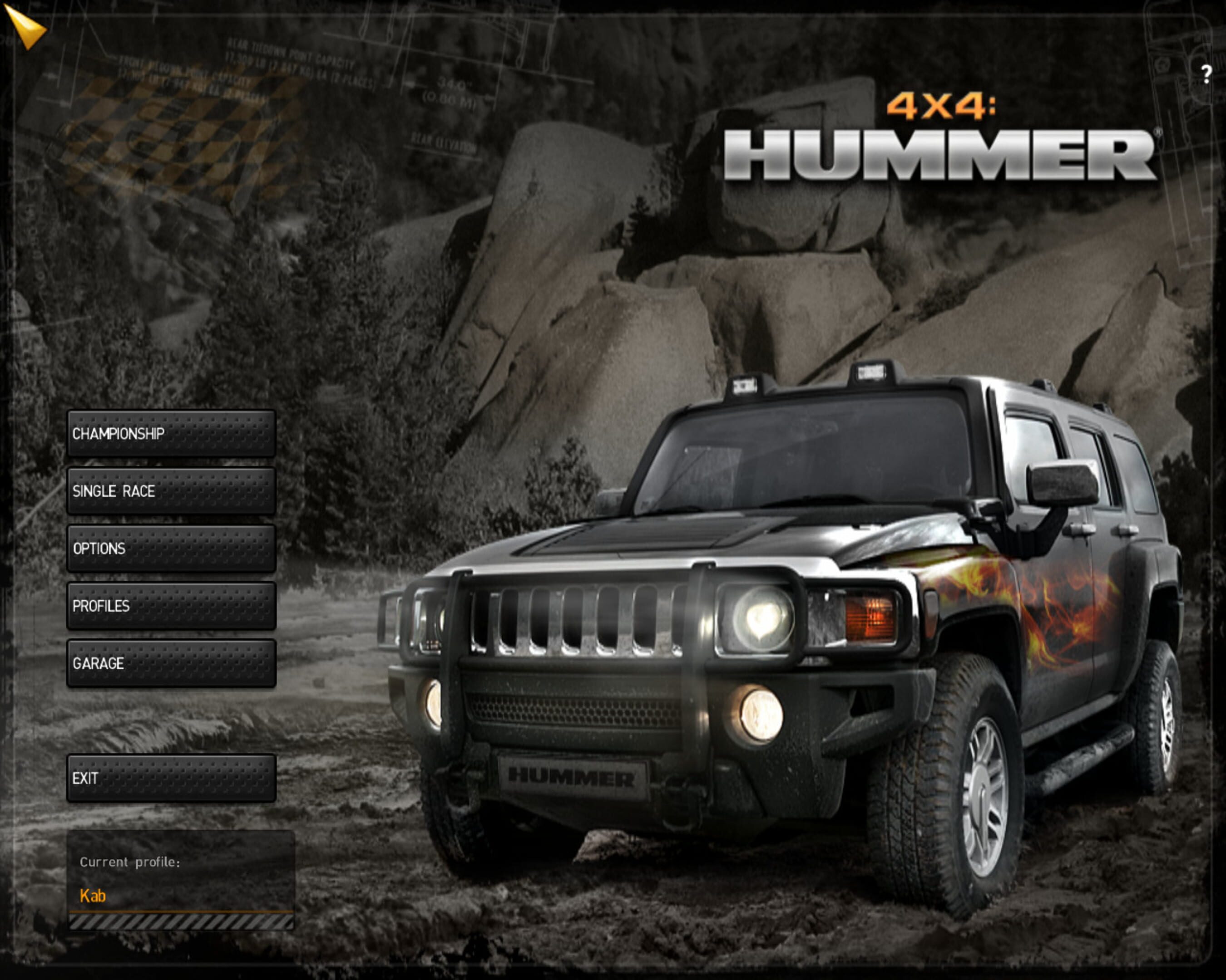 4×4 Hummer is a racing game where the player can use one of ten licensed off-road vehicles by General Motors. The heart of the game is the career mode where the player has to drive successfully in different races. With the earned price money he can buy new equipment for his car. Besides the usual round courses the game also features off-road races in open terrain where the player has to orientate himself and challenges where every irregularity, e.g. knocking down the course boundaries or breaking for too long, results in a loss of points.