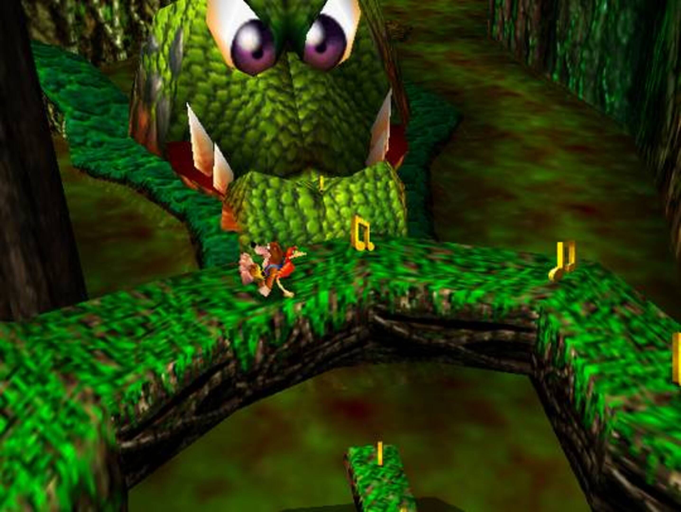 In this 3D platformer, the heroic but naive bear Banjo enlists his cowardly bird buddy Kazooie to help rescue his younger sister from a vain, beauty-stealing witch. The player is tasked with exploring the witch’s lair and the nine large, open levels within it, looking for tasks and challenges to complete. Along the way they meet a variety of characters who teach them new moves and transform them into different animals. Modeled after Super Mario 64, Banjo-Kazooie is distinguished by its cheeky and sarcastic sense of humor and by a large, varied, and novel moveset.