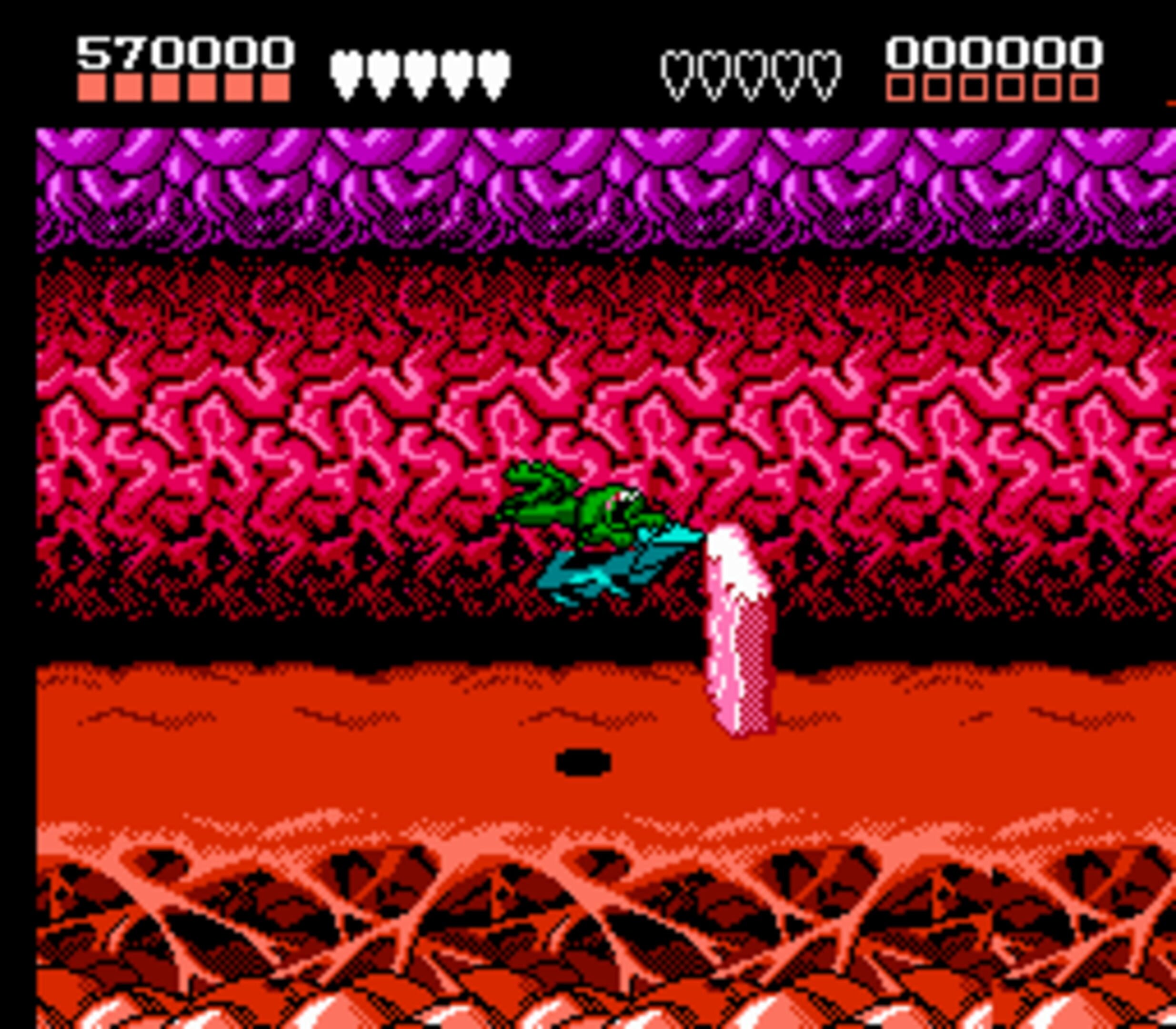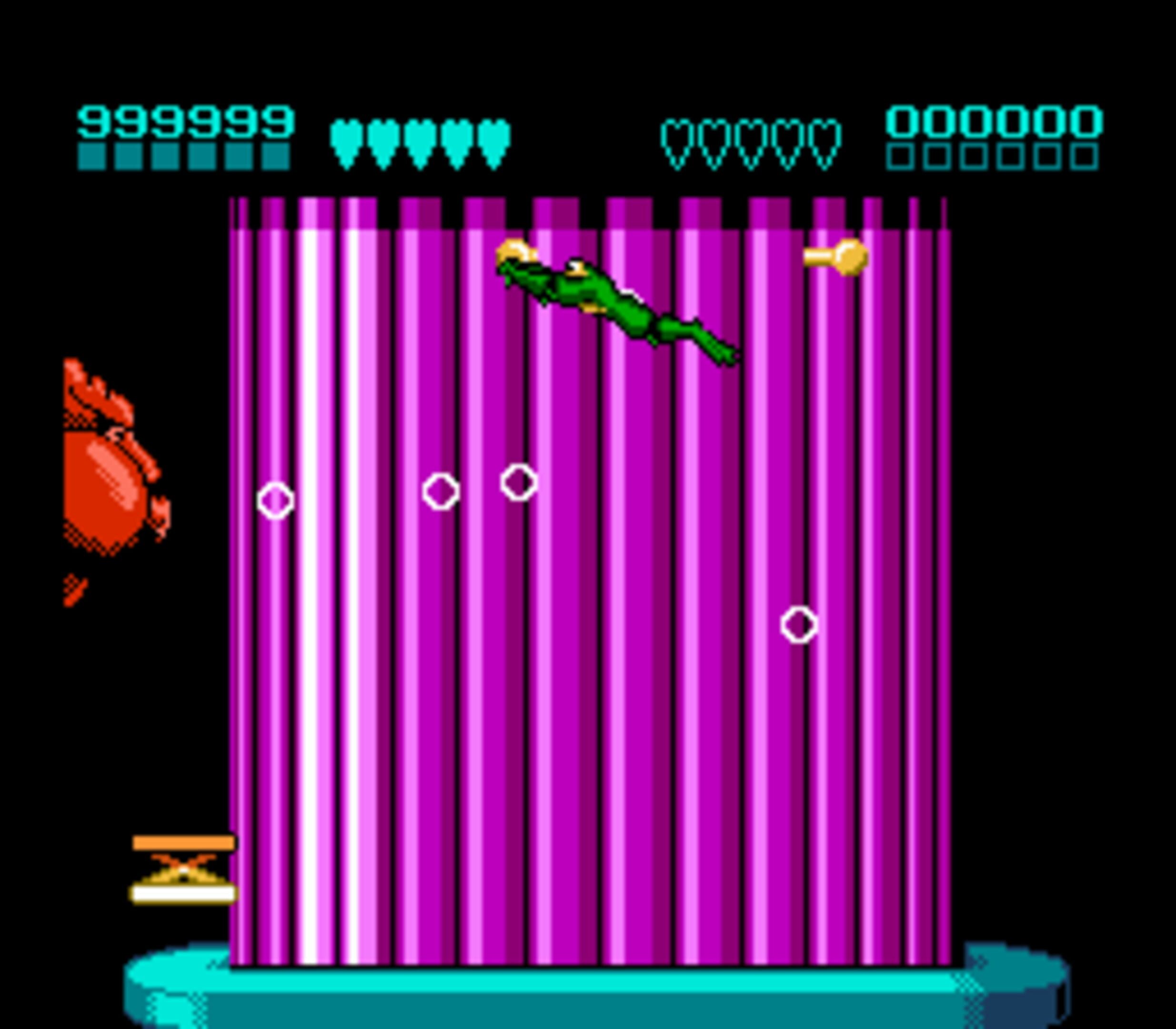 Battletoads is the first game of the Battletoads series. The game is a platform scrolling beat ’em up, with varying elements of racing, climbing and vehicle-based obstacle courses. Players start with three lives each time the game is started, which get replenished every time the player continues after getting defeated. The game contains no saving system or password features. The player has a maximum of six hit points that can be replenished by eating flies. It is by some considered to be one of the hardest games of all time, and it have previously been listed at 8th place in IGN’s “Top 10 Most Difficult Games to Beat.”