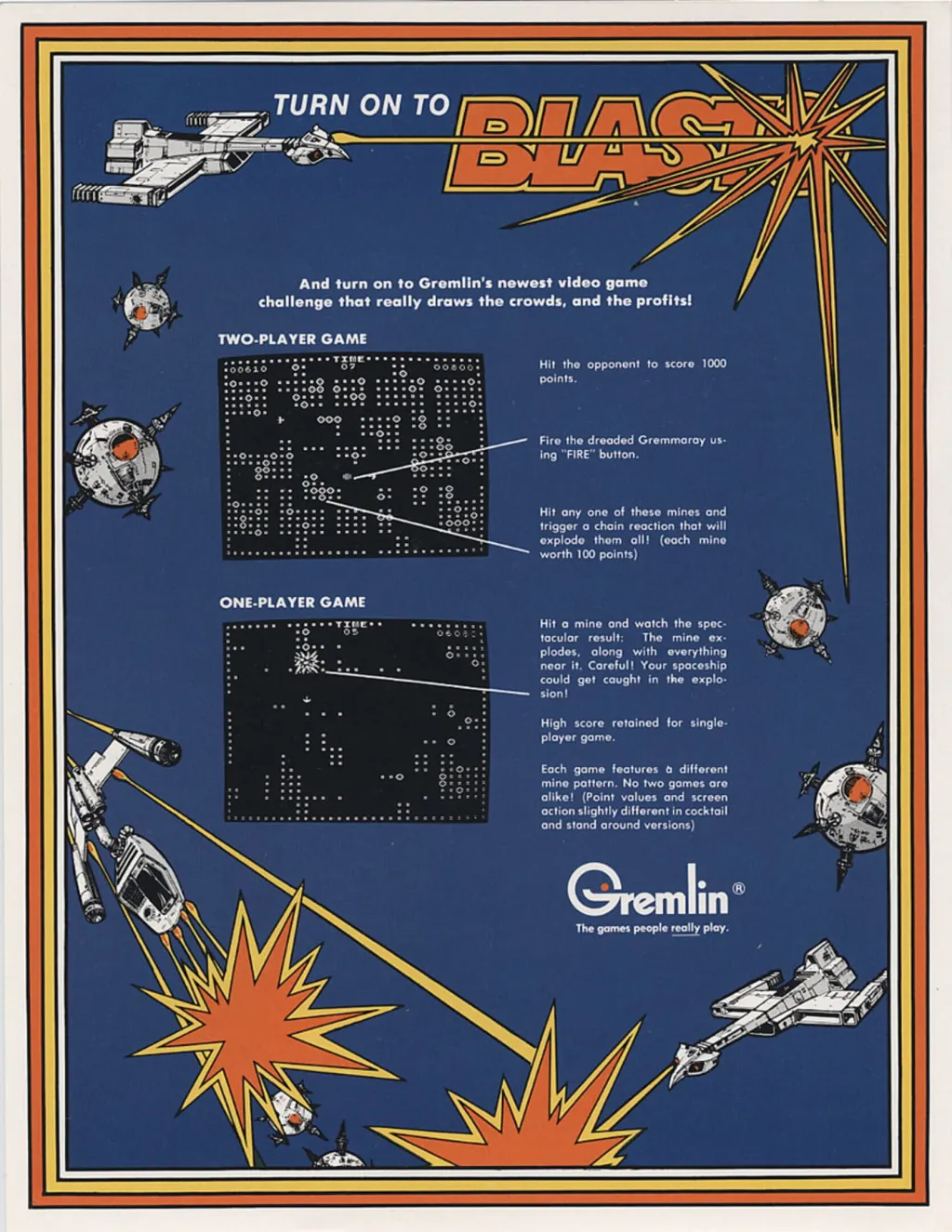 Blasto is a 1978 arcade game by Gremlin. The player controls a spaceship and must maneuver it through a mine field. The player tries to beat the clock to destroy all the mines. The World Champion for this game according to Twin Galaxies Official Electronic Scoreboard Bert Ankrom is the World Champion at the Blasto arcade game with a verified score of 8,730 points. According to the Killer List of Videogames, it is considered very rare.