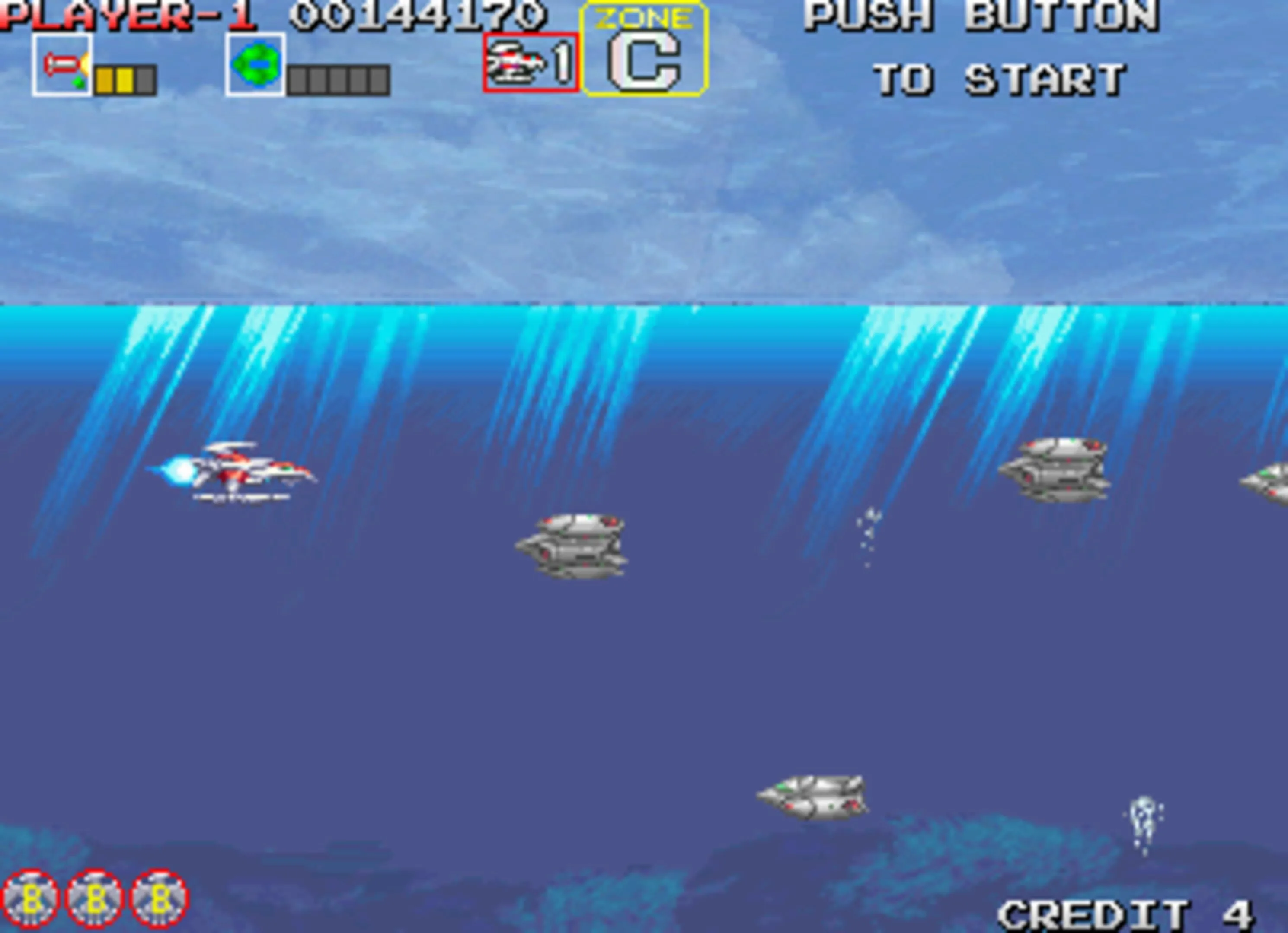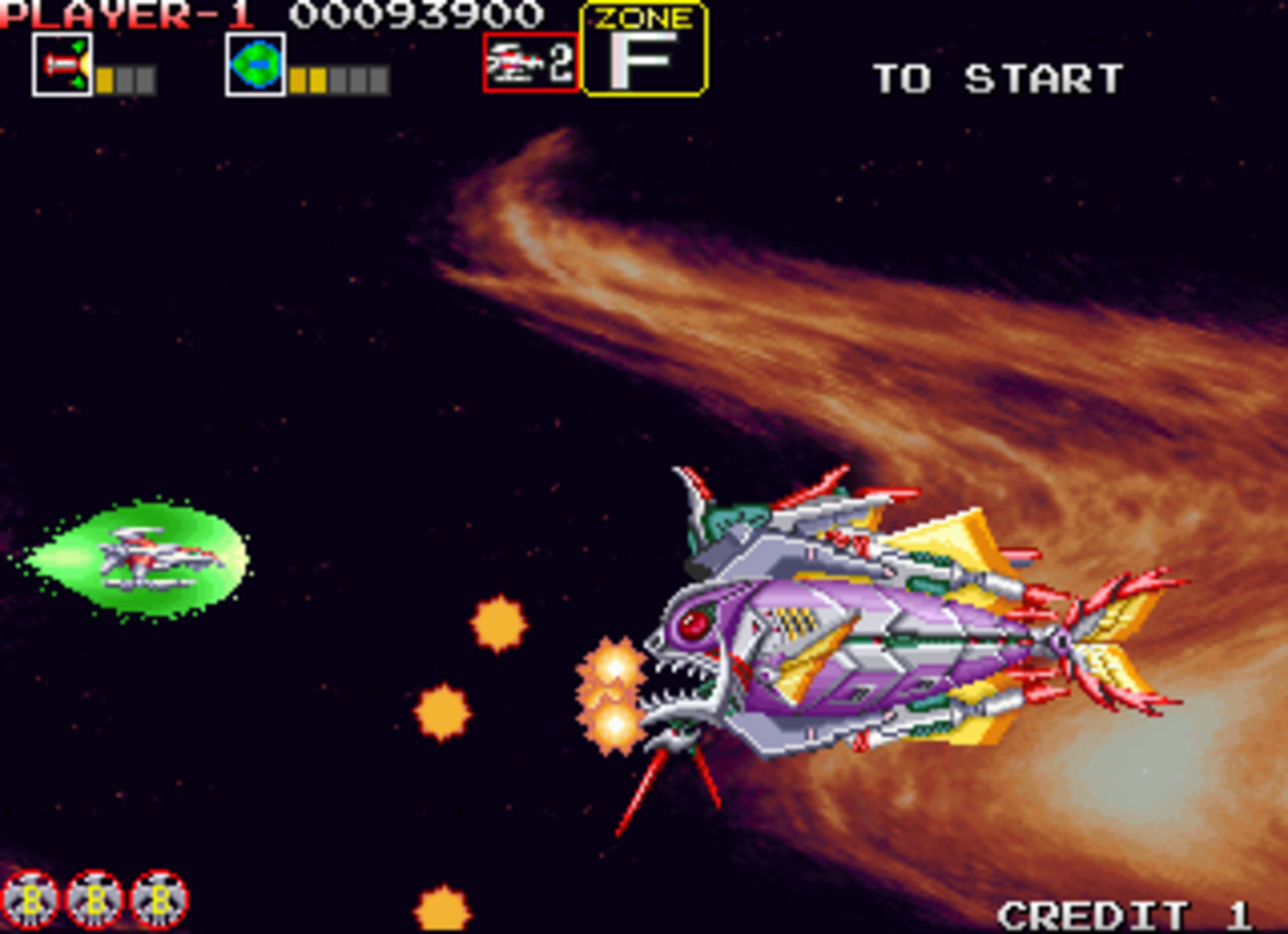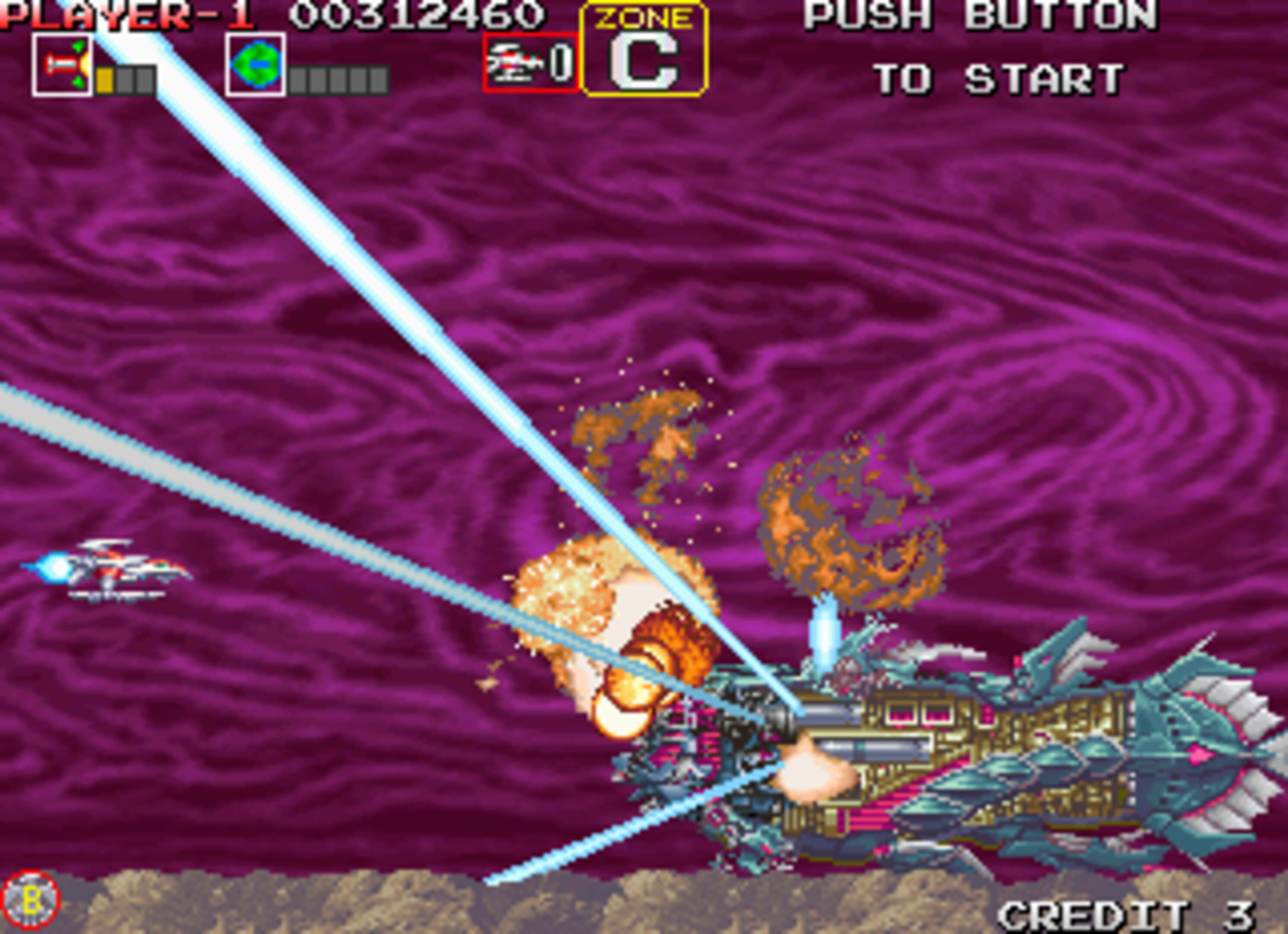 Darius Gaiden is a two-dimensional shoot’em up. The player controls a space ship named the Silver Hawk and must guide it through scrolling stages, destroying enemies and avoiding obstacles along the way. The ship is armed with forward-firing missiles, aerial bombs and a protective force-field, all of which can be upgraded by various power-ups that are dropped by specially-colored enemies when they are destroyed by the player. New to the Silver Hawk’s arsenal in Darius Gaiden is the ‘black hole bomb.’ When fired, the black hole bomb will create a large vortex in the center of the screen, which sucks in enemies and projectiles on the screen for a short moment, until it explodes into a powerful ball of lightning that inflicts massive damage onto every enemy on the screen. Another feature introduced Darius Gaiden is the ability to capture minibosses, who appear in every stage. Each miniboss has a small, circular ball placed on them that, after receiving enough damage, will detach and float away, causing the miniboss to turn idle. If the player collects the ball, the miniboss will follow and aid the player. After a brief period of time, or the player loses a life, the miniboss will explode. A few months following release, update to the arcade version was later released entitled “Darius Gaiden Extra Edition”. This version of arcade game contains rearranged levels, as well as automatically-enabled auto fire, two extra weapon power levels (bigger wave shot and a bigger red wave shot as well) and an all-stage mode which can be accessed by starting the game in 2P side.
