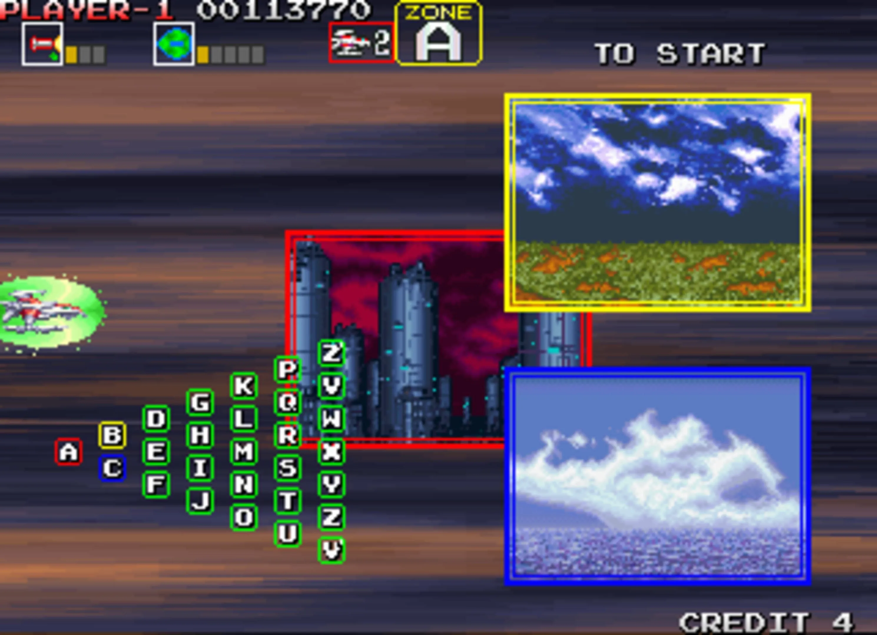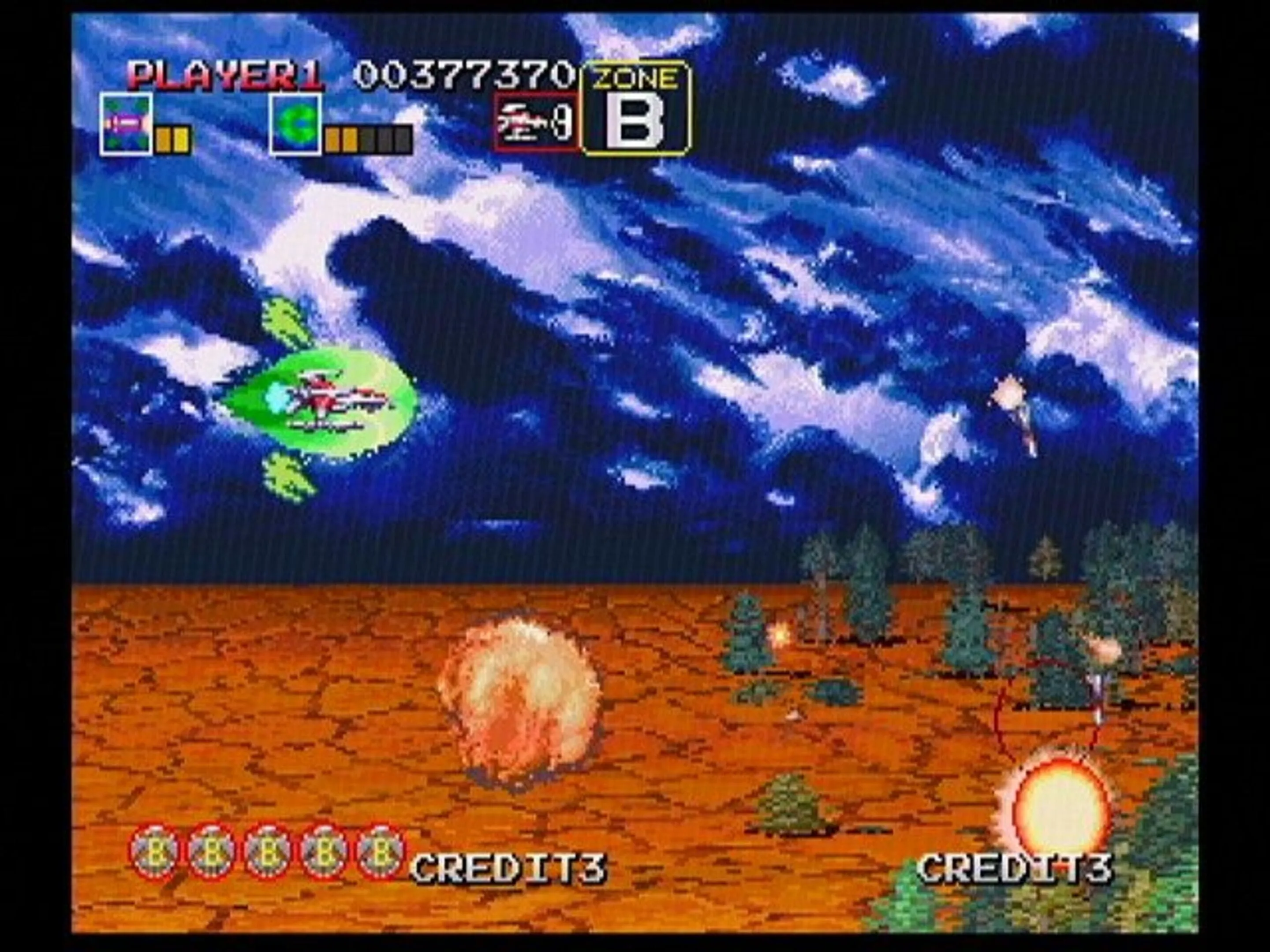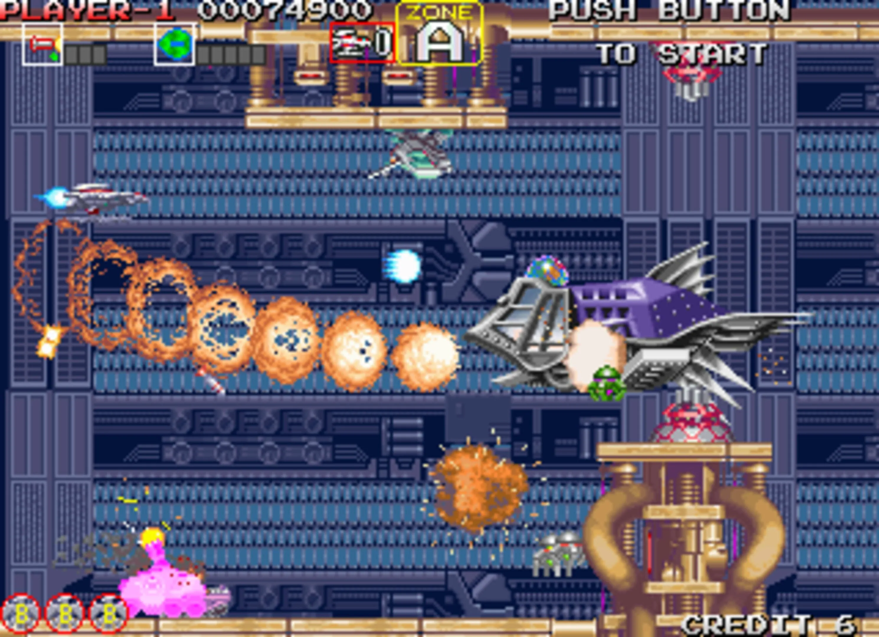 Darius Gaiden is a two-dimensional shoot’em up. The player controls a space ship named the Silver Hawk and must guide it through scrolling stages, destroying enemies and avoiding obstacles along the way. The ship is armed with forward-firing missiles, aerial bombs and a protective force-field, all of which can be upgraded by various power-ups that are dropped by specially-colored enemies when they are destroyed by the player. New to the Silver Hawk’s arsenal in Darius Gaiden is the ‘black hole bomb.’ When fired, the black hole bomb will create a large vortex in the center of the screen, which sucks in enemies and projectiles on the screen for a short moment, until it explodes into a powerful ball of lightning that inflicts massive damage onto every enemy on the screen. Another feature introduced Darius Gaiden is the ability to capture minibosses, who appear in every stage. Each miniboss has a small, circular ball placed on them that, after receiving enough damage, will detach and float away, causing the miniboss to turn idle. If the player collects the ball, the miniboss will follow and aid the player. After a brief period of time, or the player loses a life, the miniboss will explode. A few months following release, update to the arcade version was later released entitled “Darius Gaiden Extra Edition”. This version of arcade game contains rearranged levels, as well as automatically-enabled auto fire, two extra weapon power levels (bigger wave shot and a bigger red wave shot as well) and an all-stage mode which can be accessed by starting the game in 2P side.