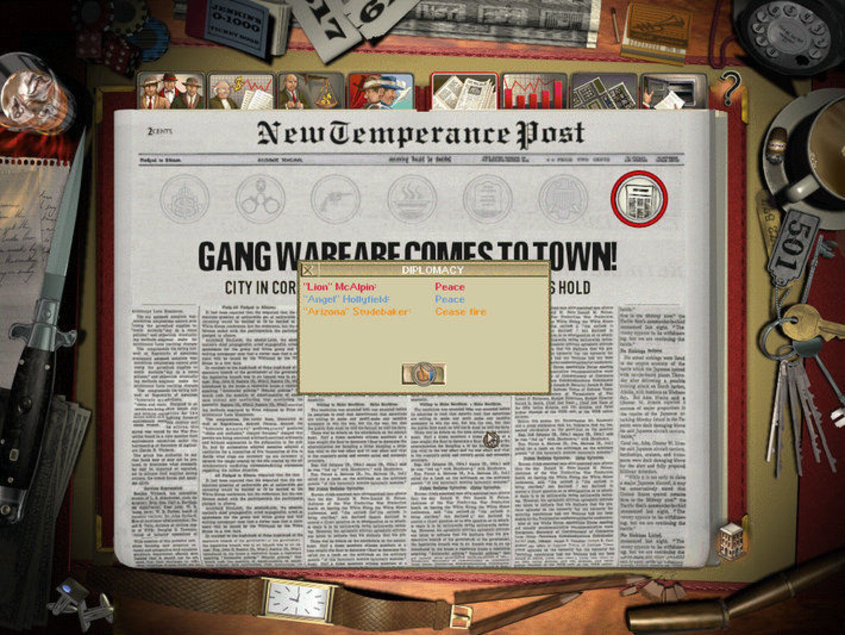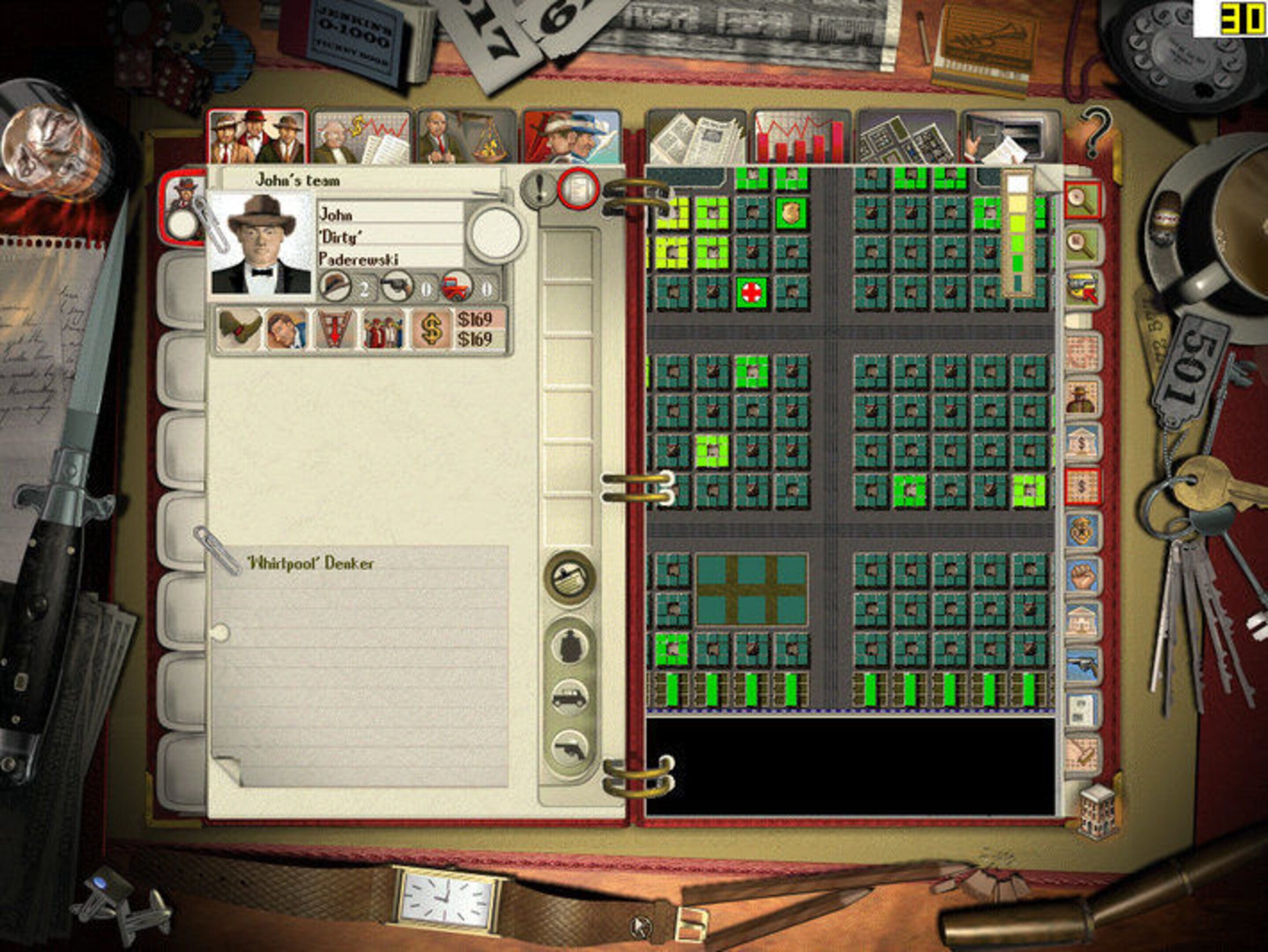 Gangsters is played by alternating between turn-based and real time gameplay. At the beginning you give orders to the gangsters (or ‘hoods’) under your control, which are then played out in front of you during the real-time aspect of the game (the working week). To have any chance of winning the game, you must begin expanding your territory by giving your hoods the order to extort businesses into paying protection money to you every week (which must be collected). You will also have to begin recruiting more hoods for your gang as soon as possible by giving your hoods the recruit order. Additional hoods can be recruited from gyms, pool halls, cafés, the docks and the unemployment office. The hoods have many different attributes such as intelligence, fists, knives, etc. which make them suitable for different missions. A hood with high knife skill and low fists skill may inadvertently kill someone he was merely sent to beat up, for instance. Hoods can be promoted to lieutenant, which gives them the ability to lead teams of hoods. It is also possible to hire a lawyer and an accountant. There are different automobiles and weapons that can be purchased to aid in carrying out missions.
