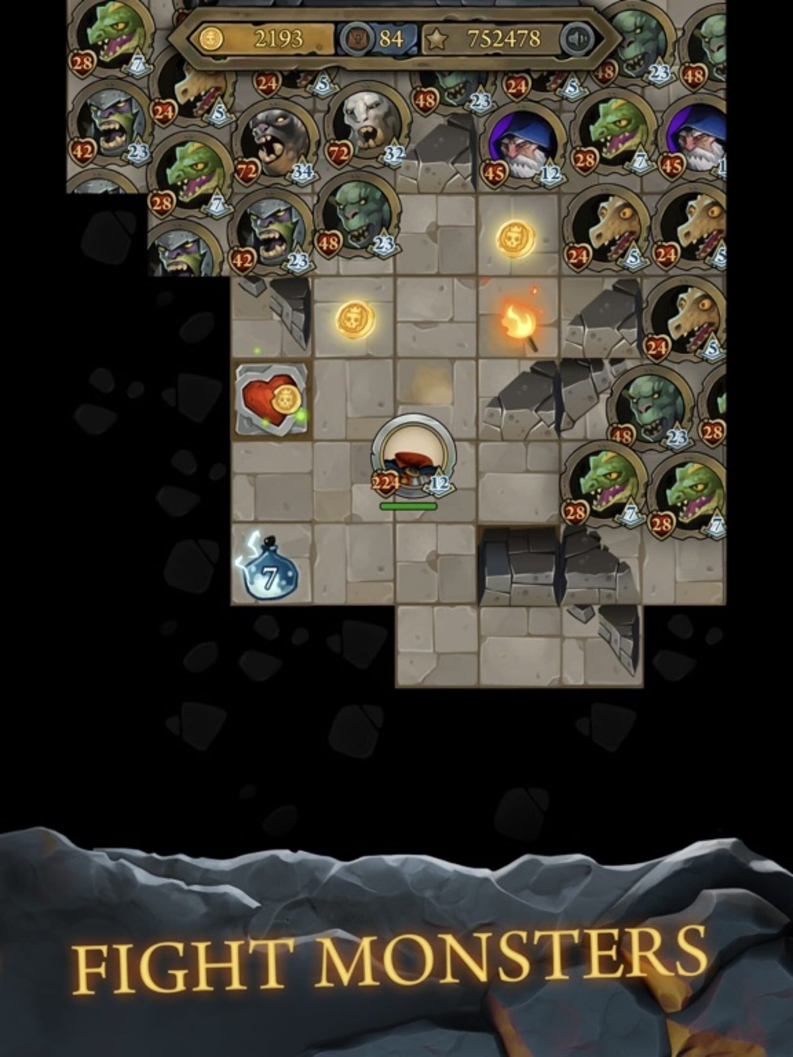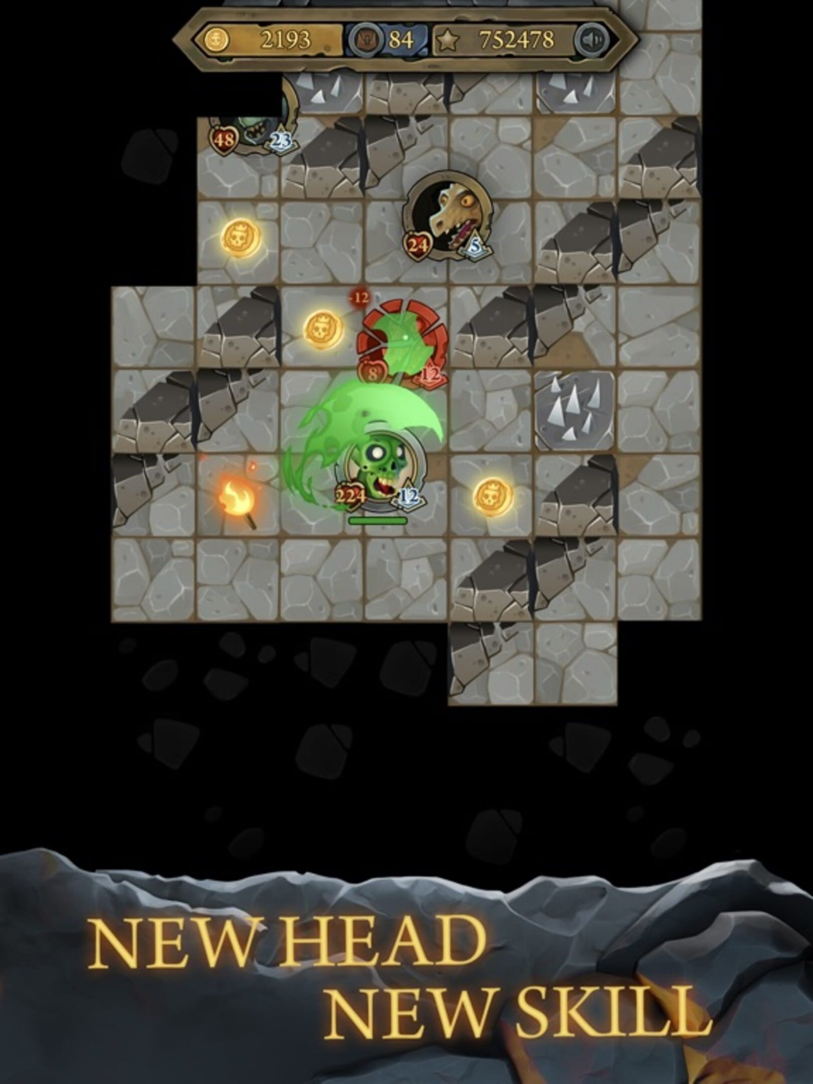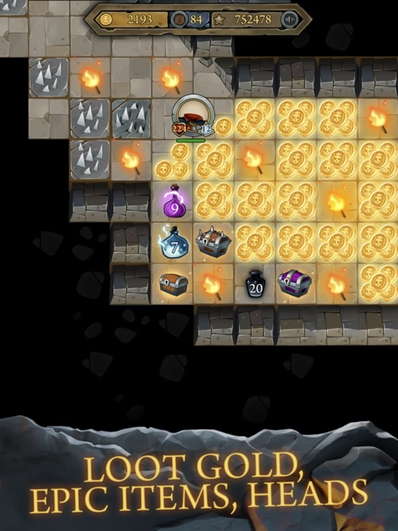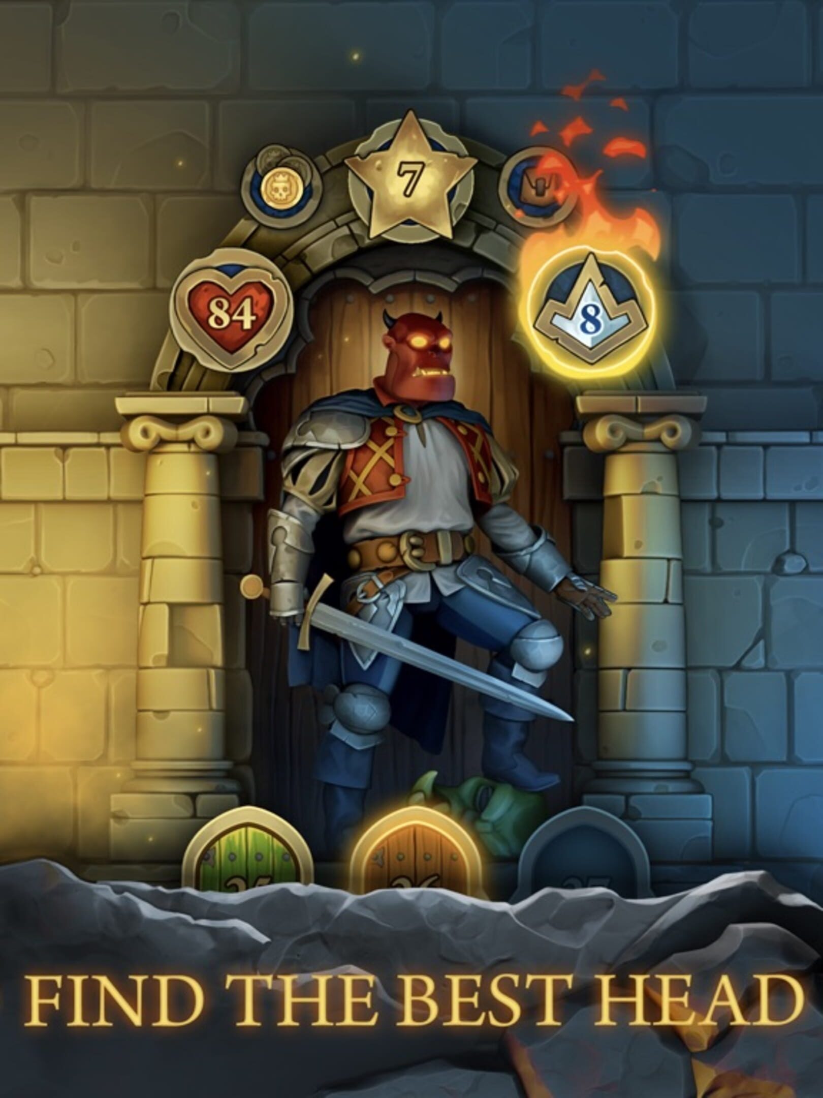 Explore randomly generated dungeon, fight hordes of monsters and vicious bosses. Loot gold, magic items and heads with unique abilities. Find the perfect head for your liking!