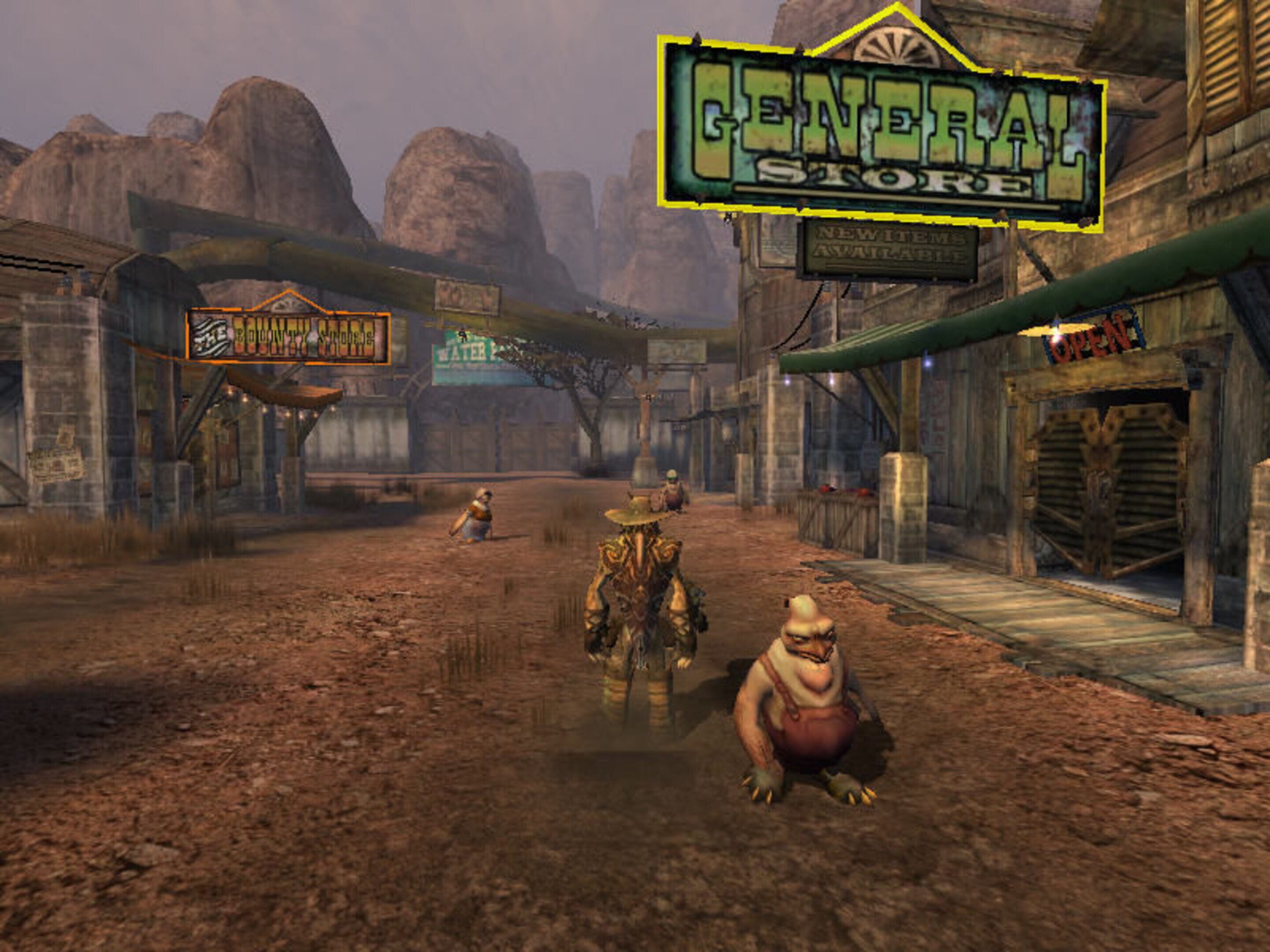 Oddworld: Stranger’s Wrath is set in the fictional Oddworld universe, differing in many ways from the preceding installment. The game incorporates two basic genres: third-person platforming action and first-person shooter. The player can switch between the modes at any time by using a melee or a ranged weapon, respectively. The goal of the game, for the most part, is to bag the outlaws and bring them in, collecting “moolah” (the game’s currency) in the process. The Stranger can stun or knock down enemies, as well as use a stealthy approach, e.g. hiding in long grass to surprise the enemy.