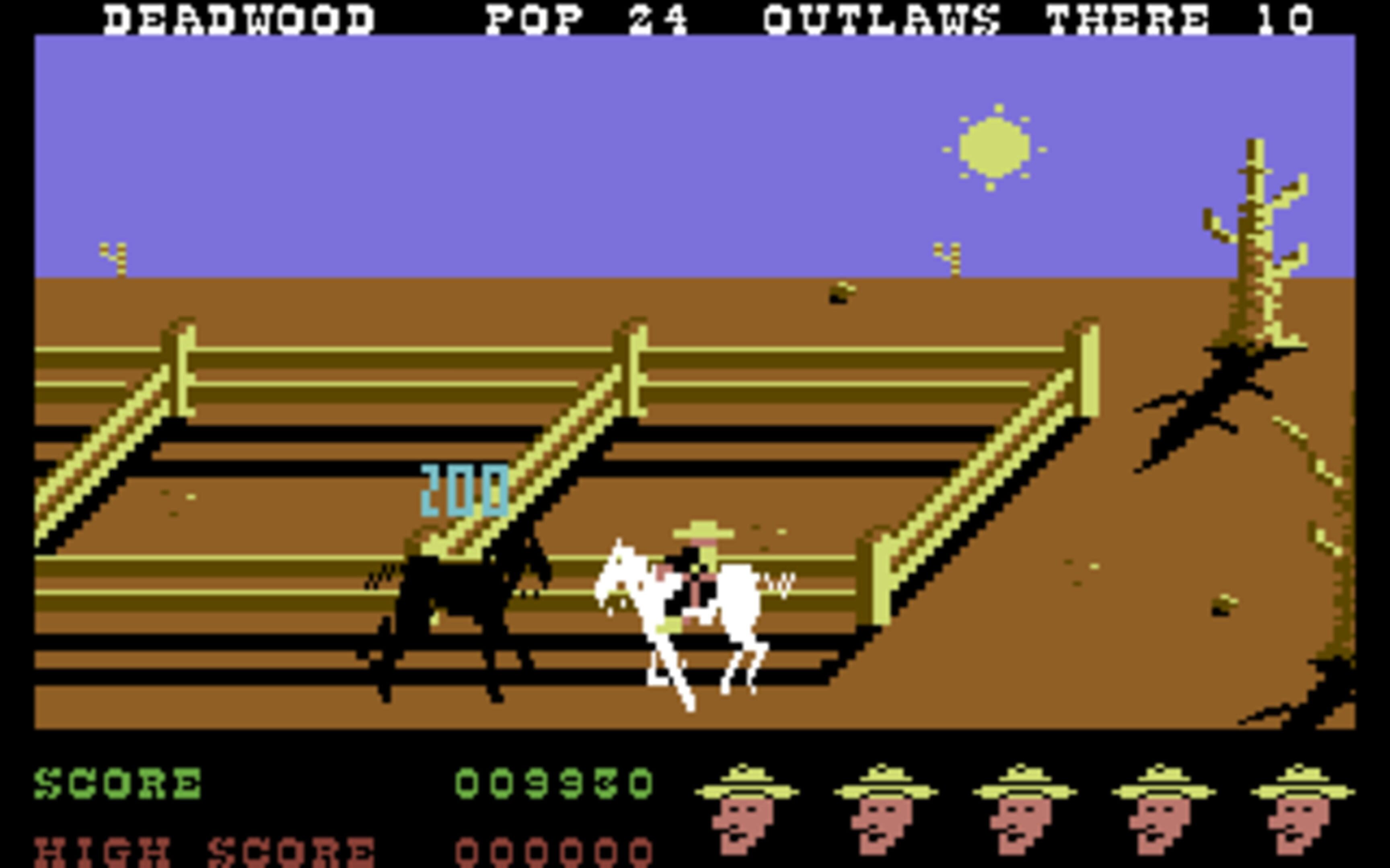 In Outlaws you play a wild west hero called Lone Rider. The game takes place on the prairie, and in cities. It’s a side-scroller, and you sit on the back of your horse during the entire game. The enemies in the game are mostly bandits, but occasionally Indians will attack you as well. You can ride in both directions, fire at enemies with your handgun, and jump over obstacles with the horse. To avoid being shot, you can also duck in the saddle.