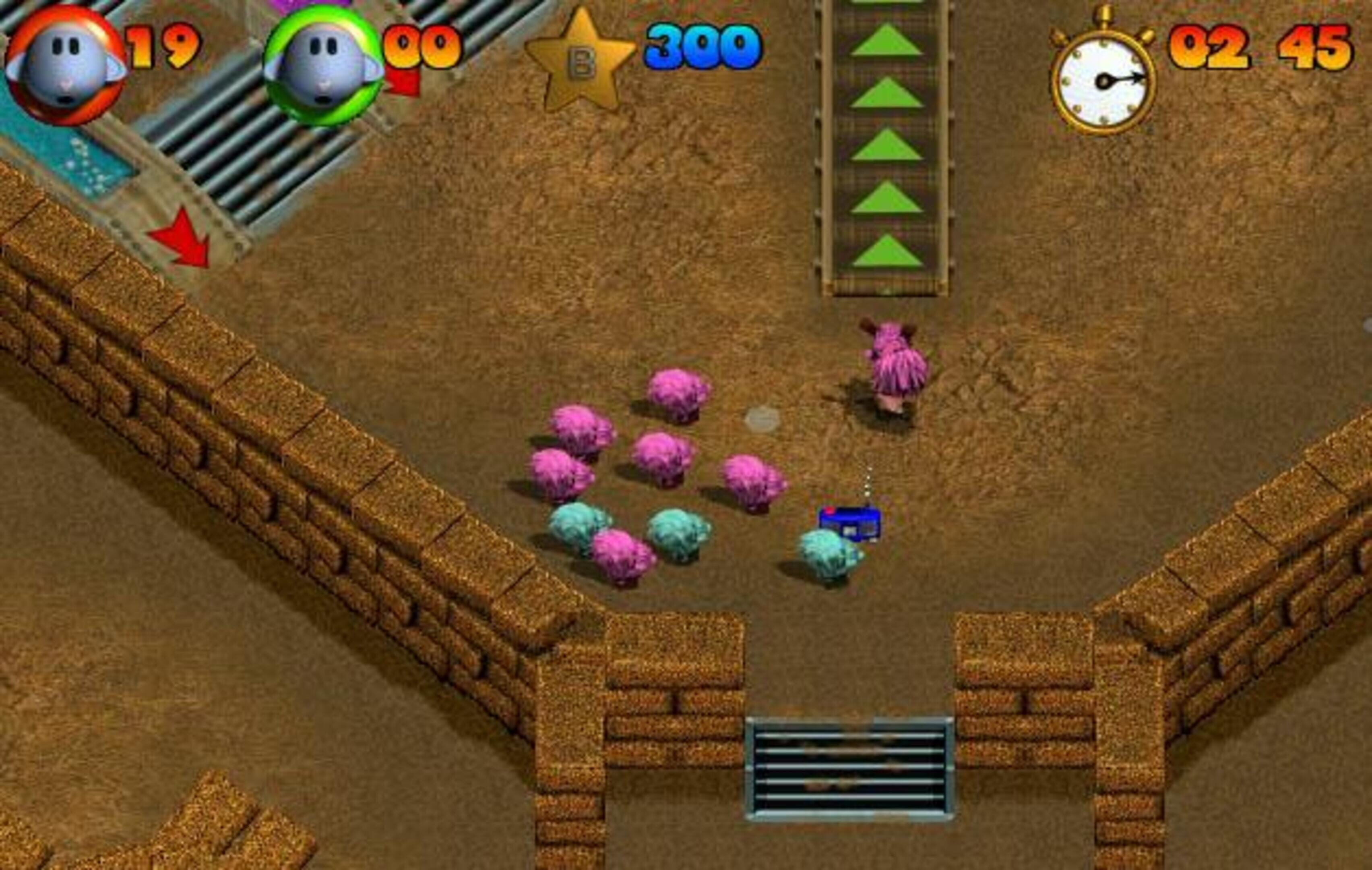 Sheep is a combination strategy and puzzle game, featuring light elements of war or battle simulations, built around a wacky story in which space-faring alien explorers from millennia ago devolve into domesticated sheep on Earth. Now their ancestors are trying to round them up by secretly enlisting the aid of two humans (Bo Peep and Adam Half Pint) and two animals (a sheepdog and a pet) through subliminal mind control. Players take the role of the Earthly “herders” to lead the flocks through six worlds with multiple levels, eventually reaching special rendezvous point where they’ll be loaded onto UFOs for the trip back to their home world of Ovis Aries. No direct control is exerted on the sheep so players must manipulate objects and obstacles, as well as rely on the strengths of each herder, to accomplish the tasks. Levels have time limits and a minimum number of sheep to be saved from each flock.