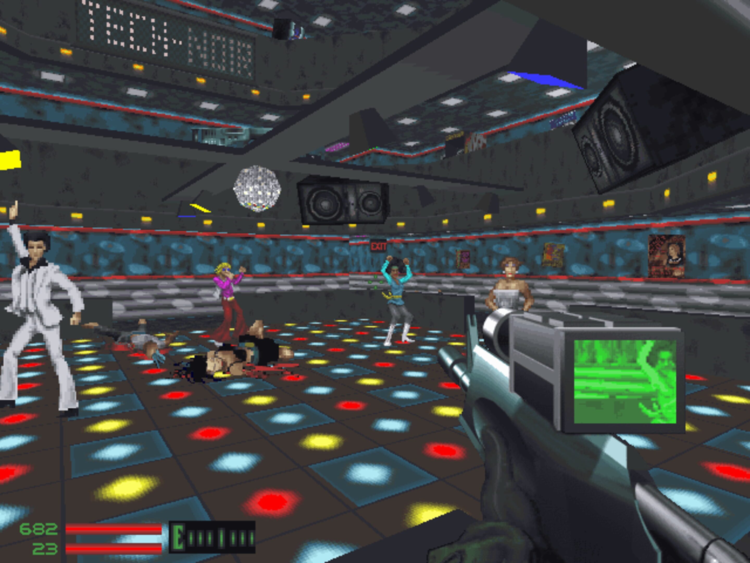 SkyNET is Bethesda’s last game based on the Terminator franchise. Originally developed as an expansion pack to Terminator: Future Shock, SkyNET eventually became its own standalone product. Its major features are an updated version of the Xngine allowing for play in the sharper 640×480 resolution (and the ability to update Future Shock to the same), a new single-player campaign, and a new multiplayer deathmatch component. In the single-player game, you must stop the machines from launching a recovered nuclear weapon. The story takes place over seven missions broken into various sections and “levels,” with night progressing into daylight as the game goes on. The locations are also more varied and interactive than those featured in the first game, with levels like the basement of the Cyberdyne building, and a sinking nuclear submarine. Driving and flying levels return from Future Shock, as do the mission briefings, which are now handled entirely in FMV. The game seems to act as a prequel to Future Shock, with the most advanced technology and player weapons from that game not appearing in the course of the single-player missions in SkyNET. The multiplayer game allows for eight players over a LAN and two over IPX. The levels are contained recreations of sections or ideas in the single-player game, like a block of cityscape, a shattered freeway, or an open valley, and many can be played at either dawn or dusk. Vehicles are available in most levels, and unlike in single-player, can be entered and exited freely. You also have the option to play as a Terminator, with reduced movement speed, a little more toughness, and the classic red-tinted vision with information overlays.