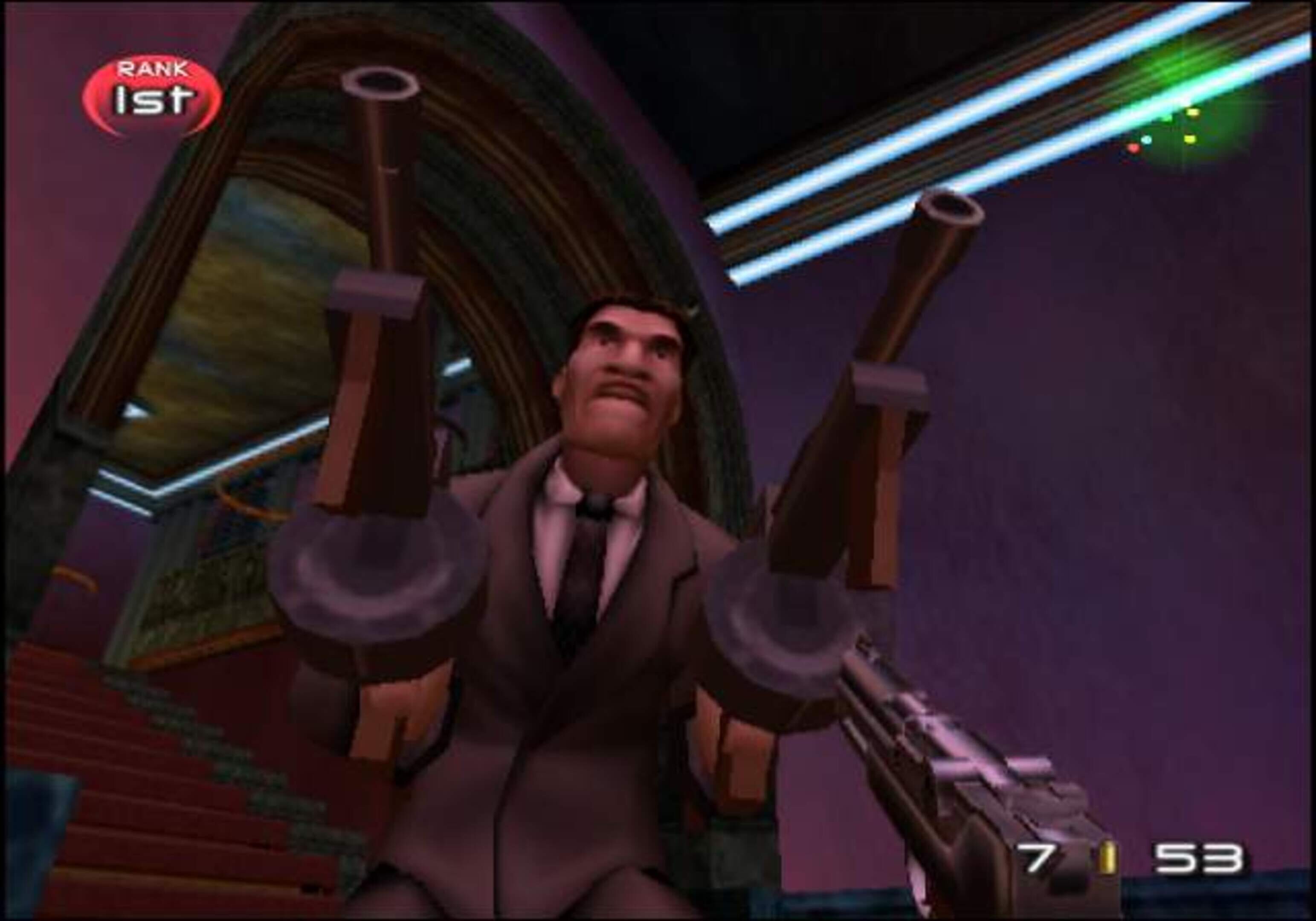 TimeSplitters 2 is a first-person shooter that requires players to kill enemies and complete objectives using a variety of weapons and tactics in different predefined scenarios. Armour and health bars on the sides of the screen lower when the player is shot, which can be increased by walking over body armor and medical kits.