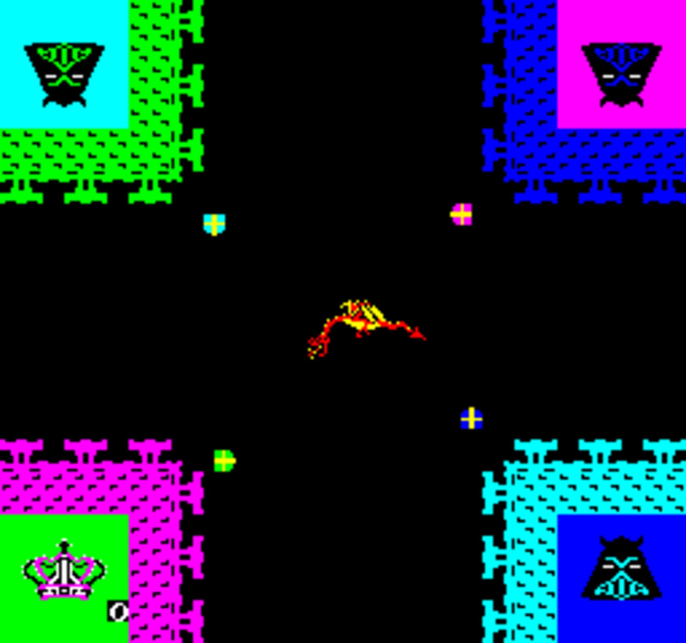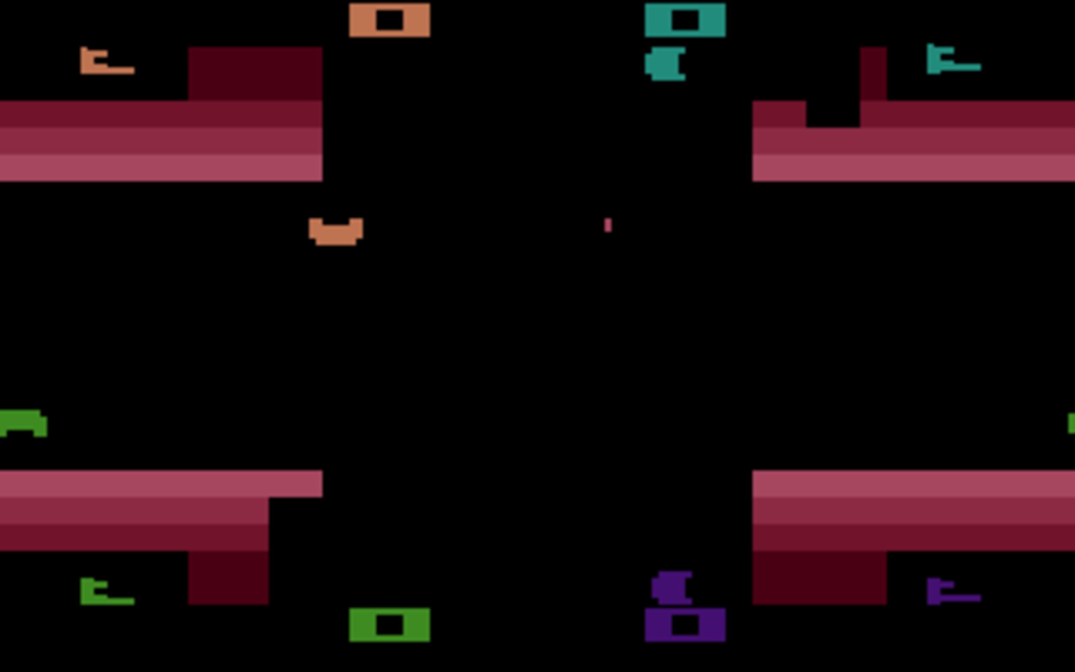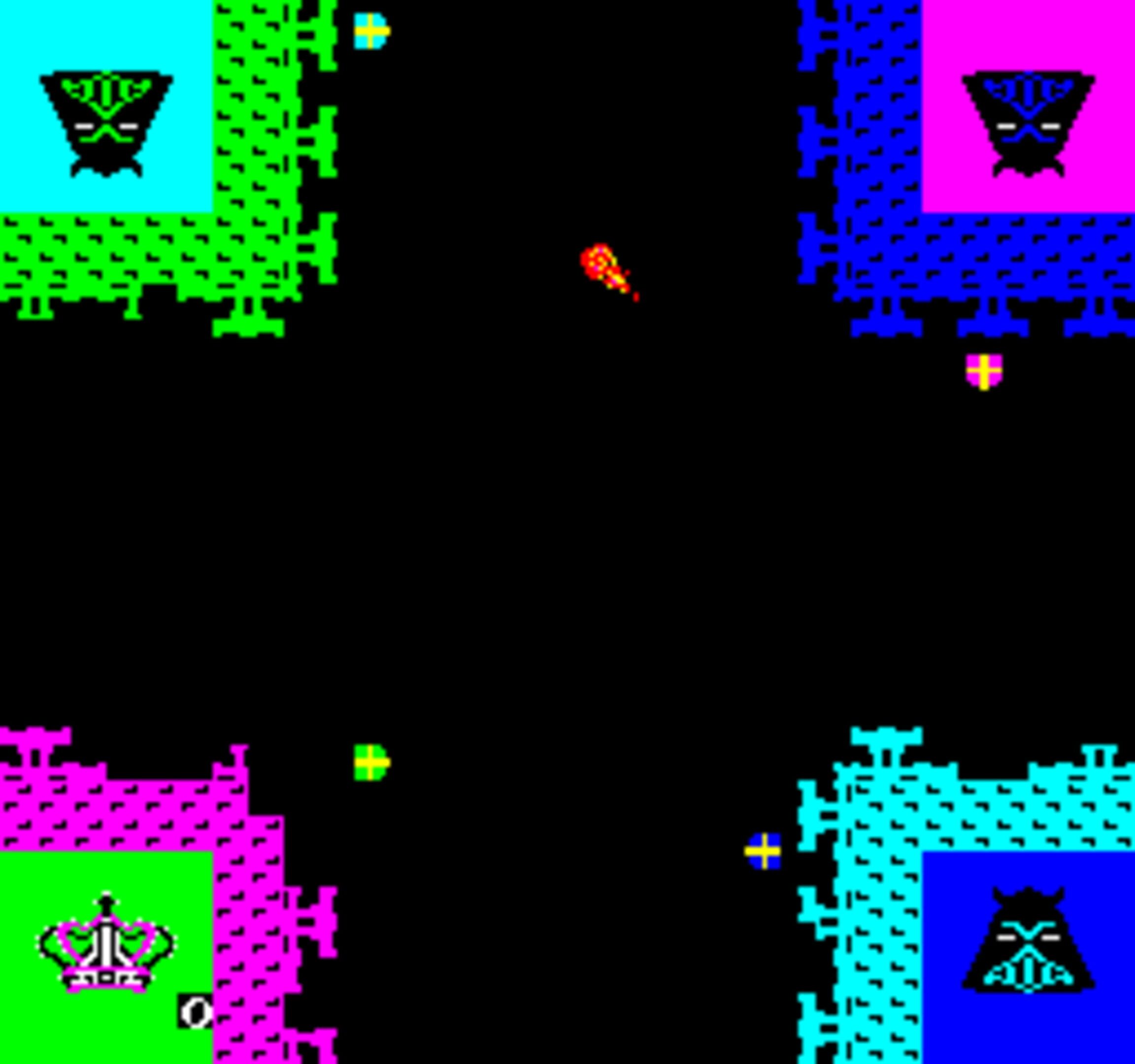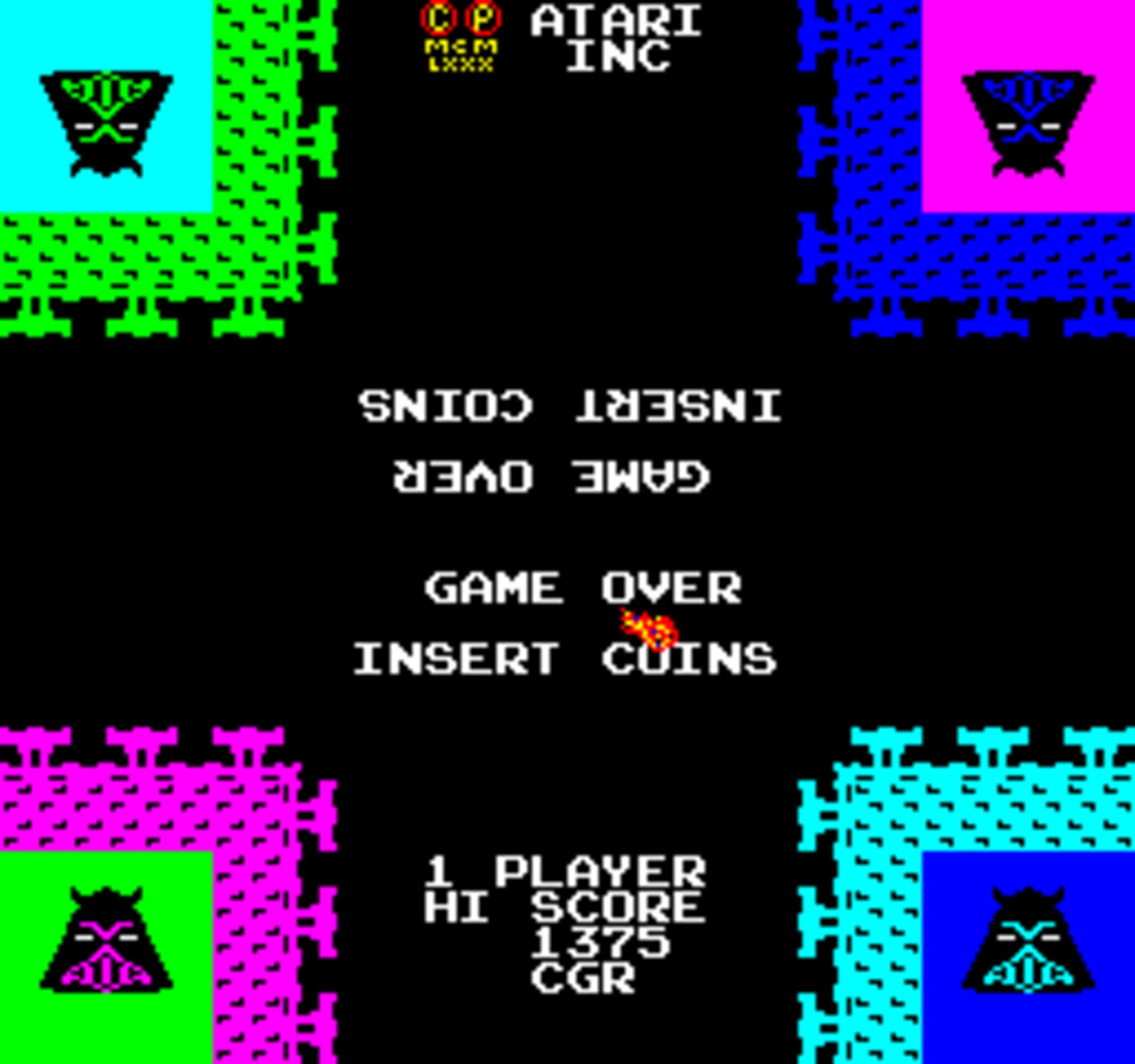 Warlords is an arcade game released by Atari, Inc. in 1980. The game resembles a combination of Breakout and Quadrapong (an early Atari arcade game) in the sense that not only can up to 4 players play the game at the same time, but also the “forts” in the four corners of the screen are brick walls that could be broken with a flaming ball. Warlords uses spinner controllers for player control, and came in both an upright 2 player version and a 4 player cocktail version. The upright version uses a black and white monitor, and reflects the game image onto a mirror, with a backdrop of castles, giving the game a 3D feel. The upright version only supports up to two simultaneous players, which move through the levels as a team. The cocktail version is in color, and supports 1-4 players. 3-4 player games are free-for-all’s where the game ends as soon as one player wins. 1-2 player games play identical to the upright version.