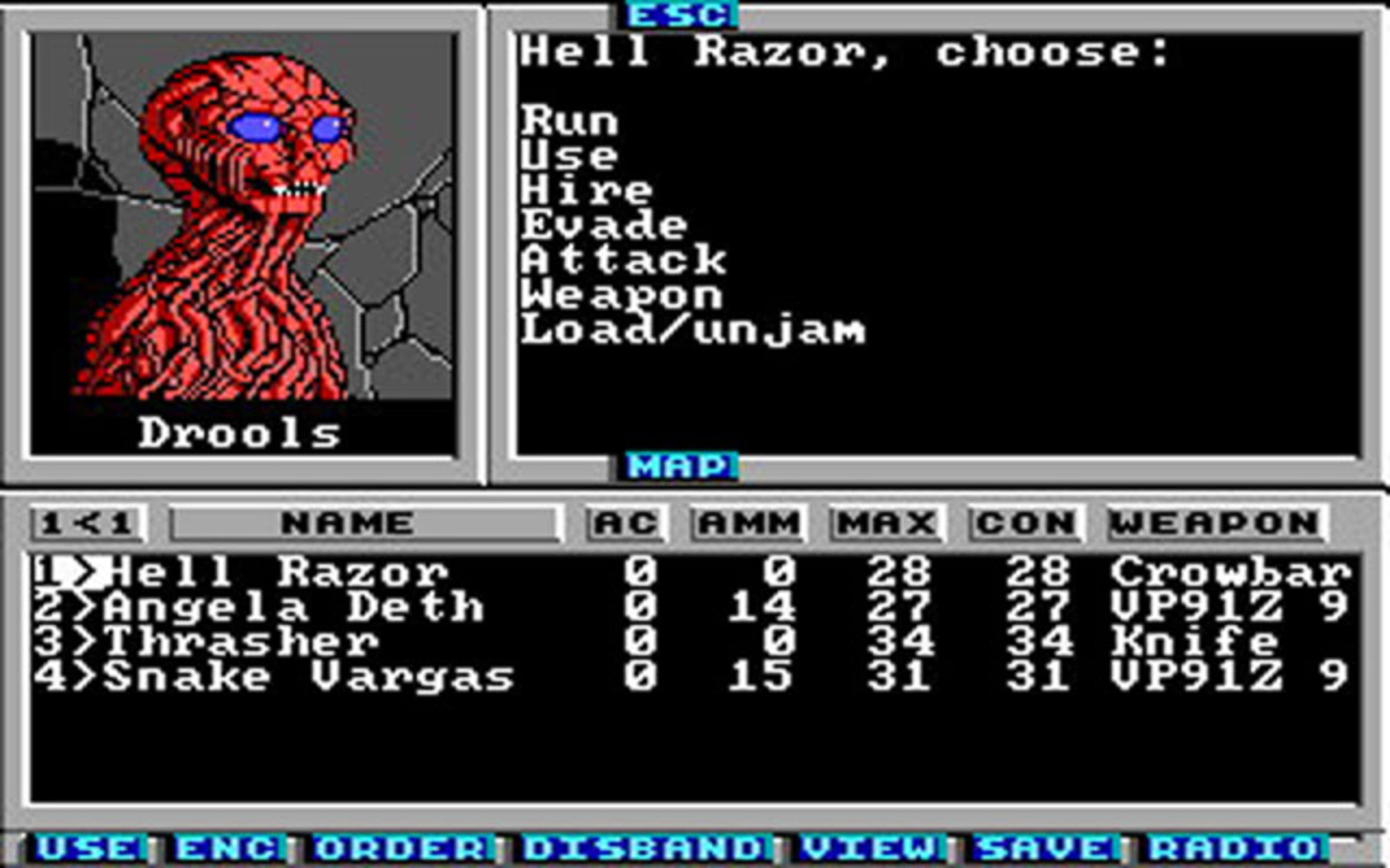 The game mechanics were based directly on those used in the tabletop role-playing games Tunnels and Trolls and Mercenaries, Spies and Private Eyes created by Wasteland developers Ken St. Andre and Michael Stackpole. Characters in Wasteland consequently have various statistics (strength, intelligence and luck among others) that allow them to use different skills and weapons. Experience is gained through battle and through use of skills. The game would generally let players advance with a variety of tactics: to get through a locked gate, a player could use his picklock skill, his climb skill, or his strength attribute; or he could force the gate with a crowbar – or a LAW rocket. The initial band of Desert Rangers encountered a number of NPCs as the game progressed who could be recruited into the party of up to seven. Unlike those of other computer RPGs of the time, these NPCs might temporarily refuse to give up an item or perform an action if ordered to do so. The game was also noted for its high and unforgiving difficulty level and for such combat prose as “reduced to a thin red paste” and “explodes like a blood sausage”, which prompted an unofficial PG-13 sticker on the game packaging in the United States. Wasteland was one of the first games featuring a persistent world, where changes to the game world were stored and kept. Returning to areas later in the game, one would find them in the state one left them in, instead of being reset to their original state, as was common for games of the time. Since hard drives were still rare in home computers in 1988, this meant the original game disk had to be copied first, as the manual instructed one to do.