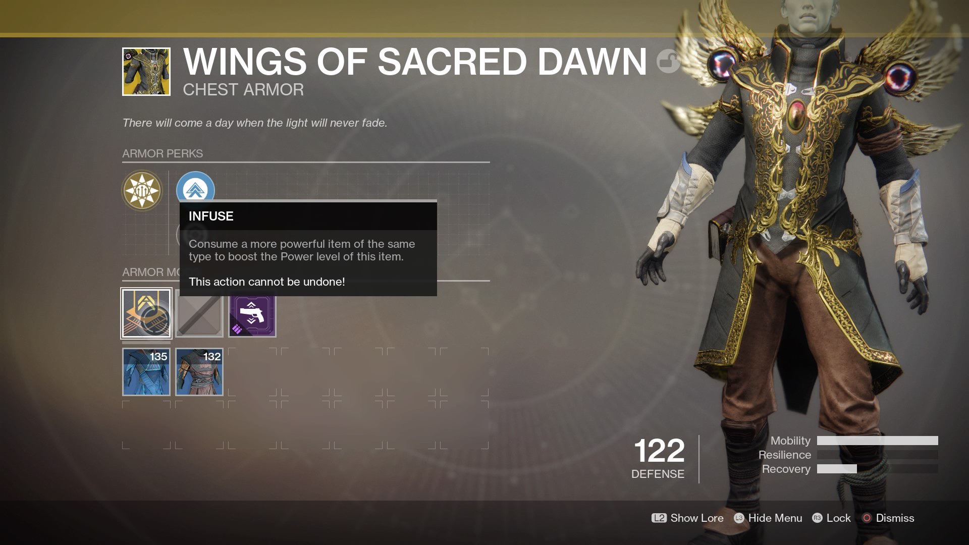 This is done by going to your character menu, pressing triangle or Y to go to details, selecting infuse under armor mods, and then sacrifice whatever more powerful armor or weapon you have to make it stronger. You can only sacrifice items of the same category, and it costs glimmer and/or legendary shards to complete.
