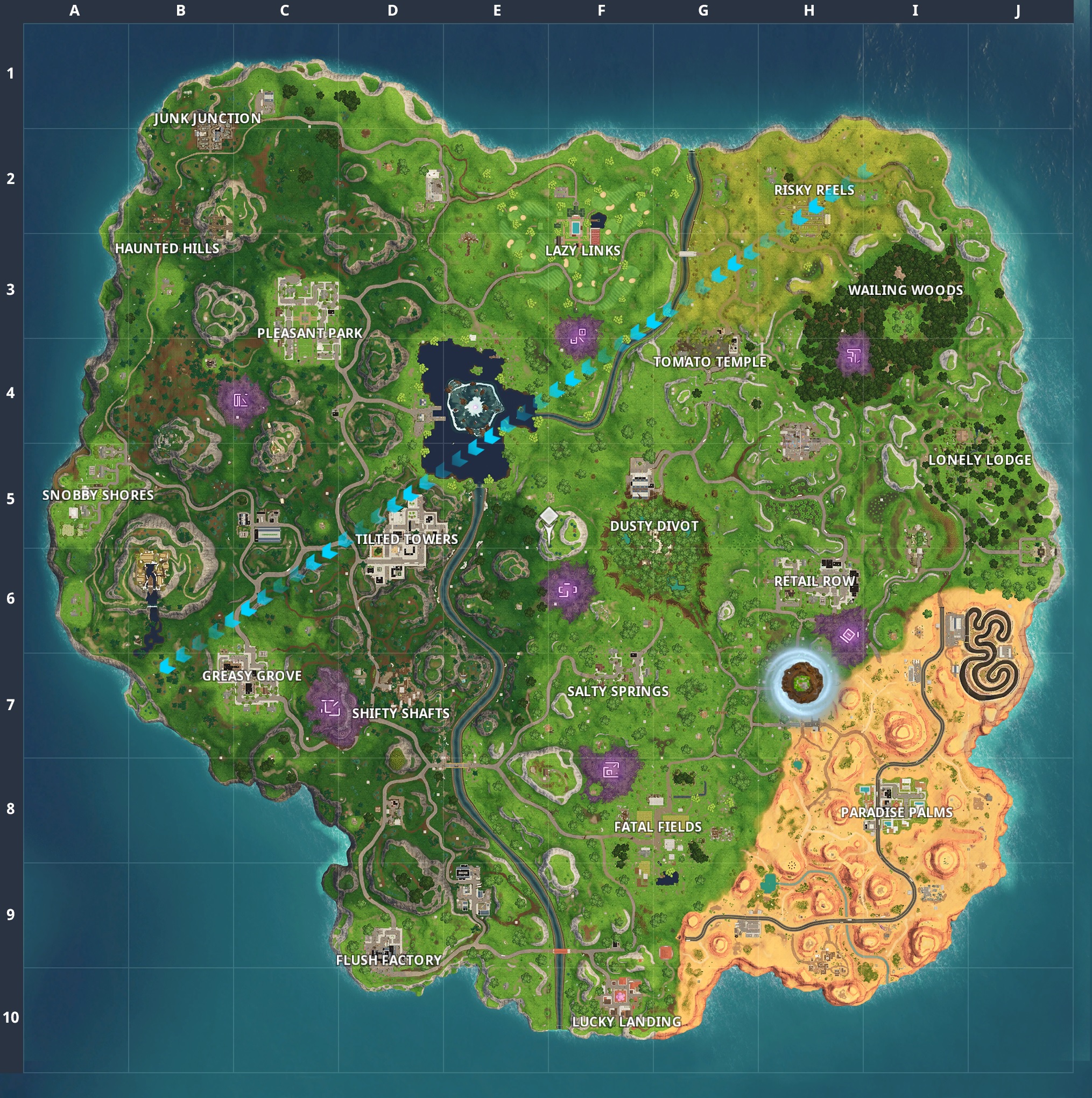 With this being very similar to the “Visit the centre of the named locations” challenge from July’s season 5 challenge, it’s clear that the first stage is one you’re going to have to be very clever about. With the two locations of Risky Reels and Wailing Woods being in close proximity to each other, it’s not too difficult but, still, plan ahead.
