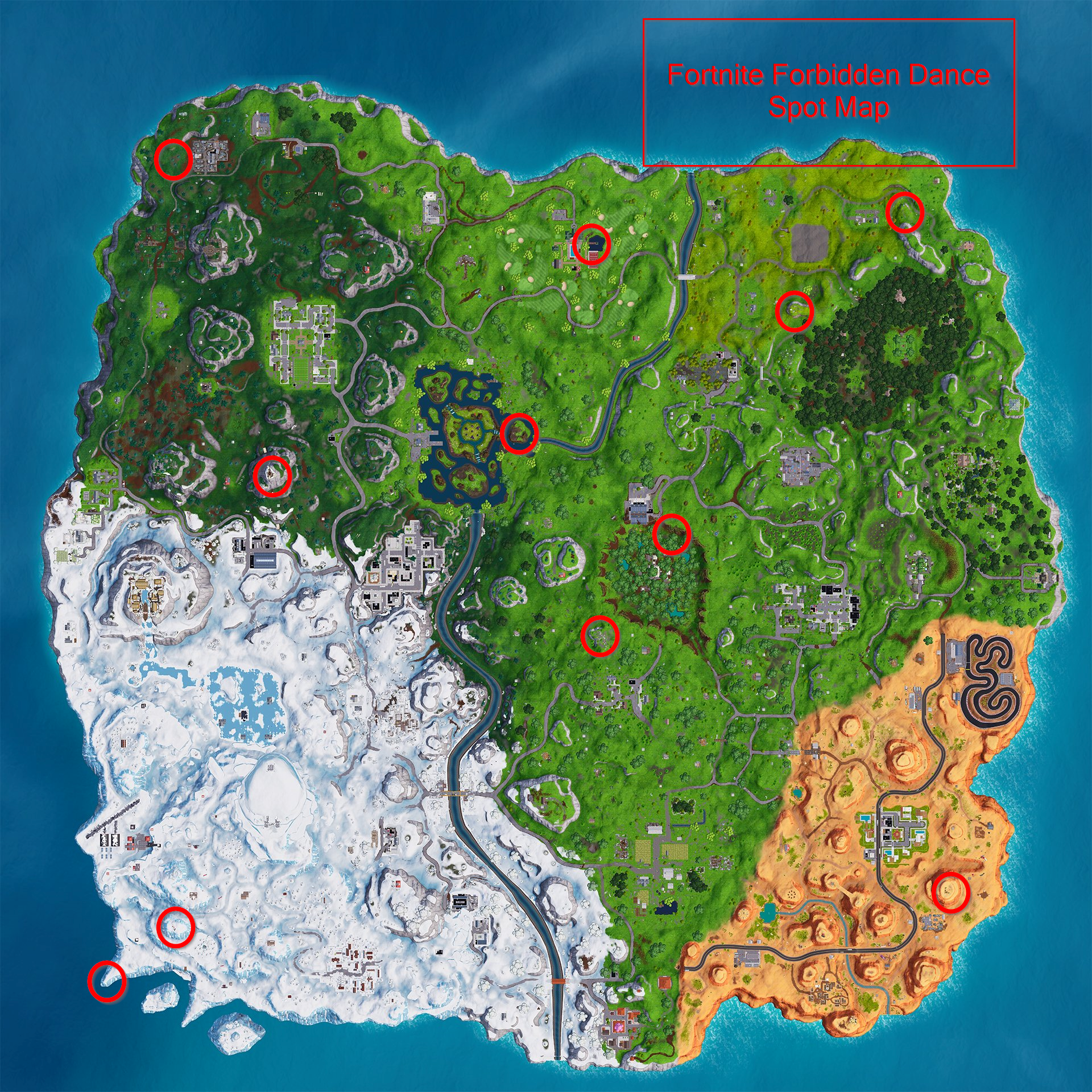 The Fortnite Forbidden Dance challenge has you running to different spots on the map marked by a no dancing sign. You have to break the rules and dance on these forbidden areas to complete one of the Fortnite season 7 challenges. There are 11 different places you can dance, and you can use our Fortnite forbidden dance locations map below to find them all.