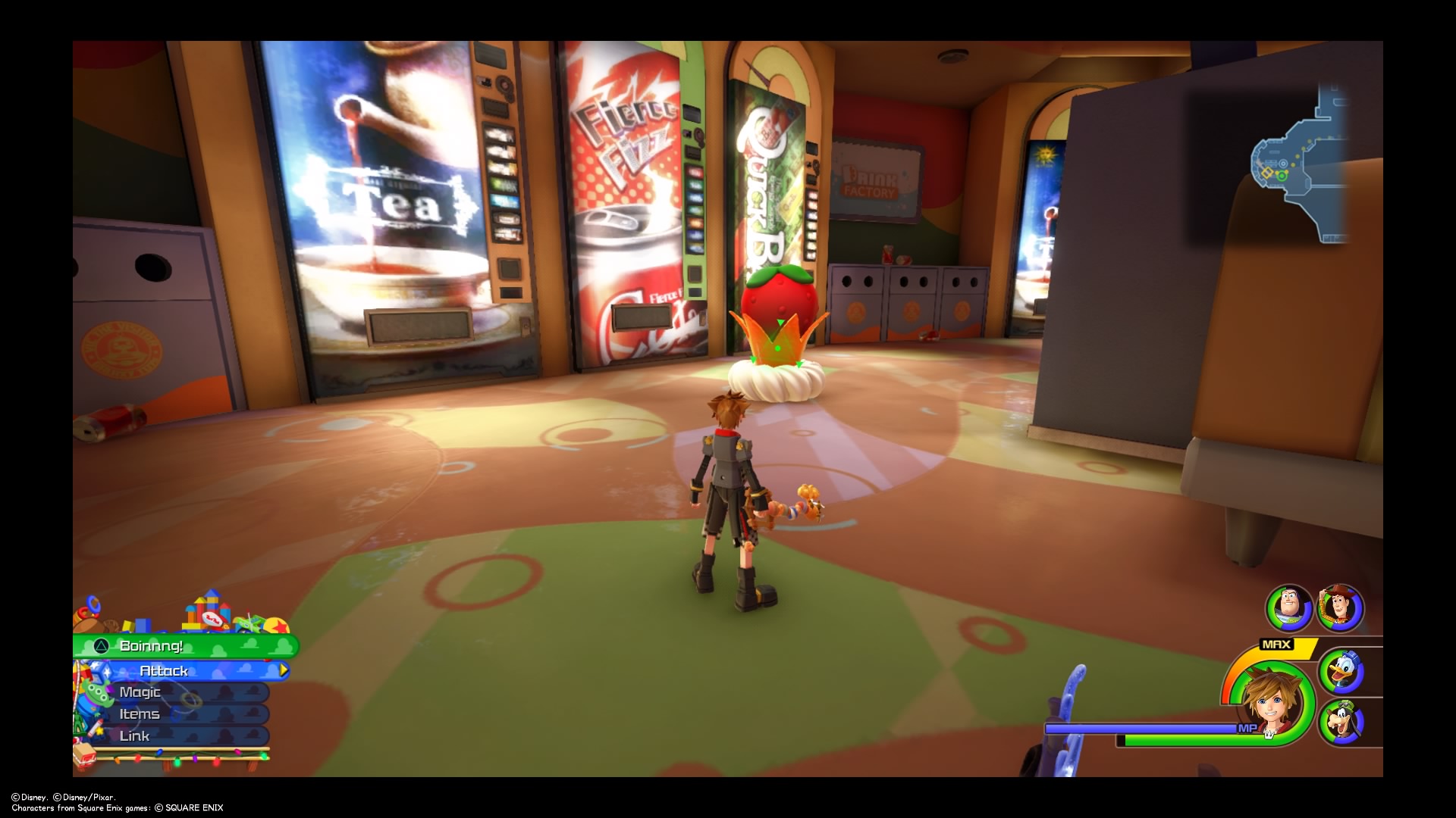 The next Kingdom Hearts 3 Flantastic location will require you to head to the Galaxy Toys Rest Area save point in the Toy Box world. Look for the vending machines on the back wall, and make a beeline for them. The Strawberry Flantastic will be right there in front of them, so you can’t miss it.