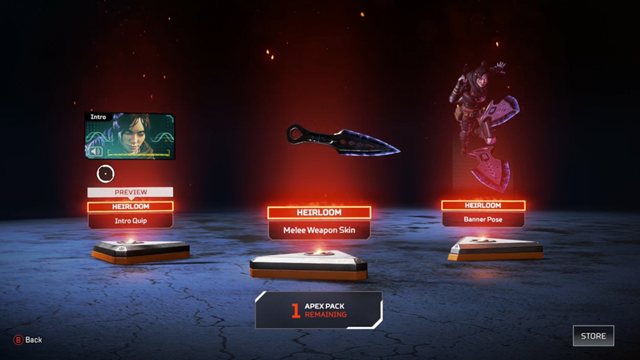 Okiiee on YouTube was lucky enough to earn the Wraith Heirloom seen above. The Wraith’s Knife comes in a three-item set from an Apex Pack, the same as any heirloom set, and has a distinctive red glow once unlocked. This “Kunai” secret knife skin replaces Wraith’s melee weapon attack, and is accompanied in the set by the intro quip “Come find me,” as well as “Fearless” banner pose. Thankfully, as they all come in one set, you won’t have to unlock these heirlooms individually. More heirloom sets are expected to come in the future for other characters, but Wraith is currently the only character with a dedicated heirloom set.