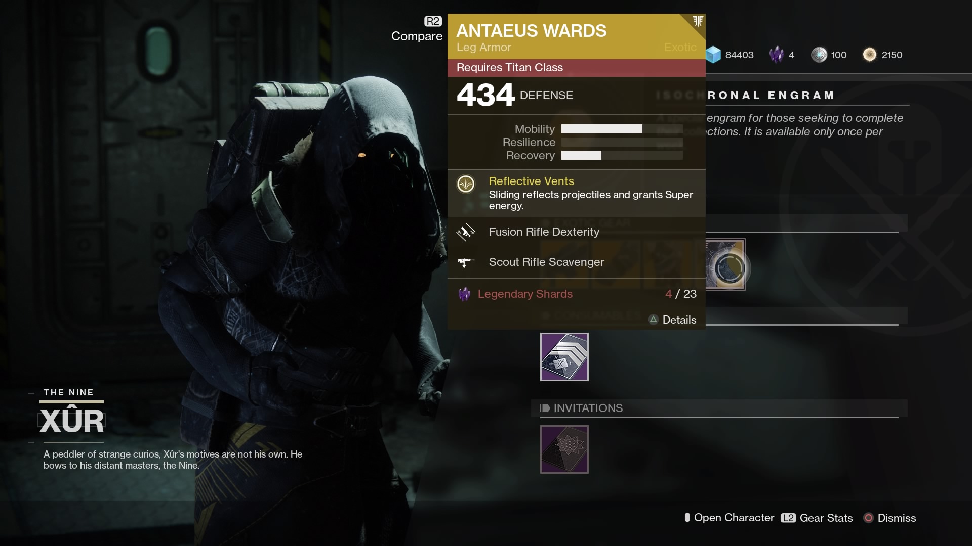 As ever, Xur is also packing an Isochronal Engram for an eye-watering 97 Legendary Shards. That gifts you a Year One Exotic that you’ve never received before. Also, parting with nine Legendary Shards will net you the fourth Invitation of the Nine this week, which is well worth a shot.