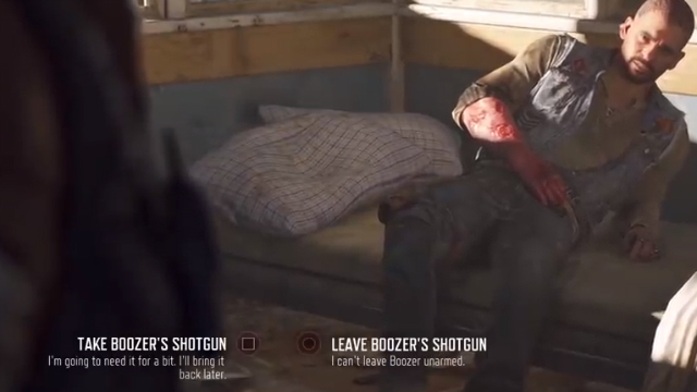 In the final game, when Boozer is injured, and Deek brings him back to the forest tower to heal, Deek hands back over Boozer’s shotgun before he heads back out. However, in the Alpha version of Days Gone you got two choices: