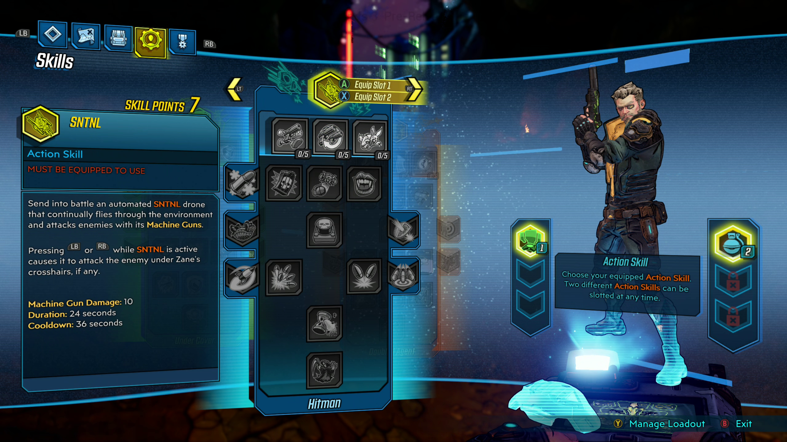 - Basic Action Skill — SNTNL: Send into battle an automated SNTL drone that continually flies through the environment and attacks enemies with its Machine Guns. LB or RB/L1 or R1 while SNTNL is active causes it to attack the enemy under Zane’s crosshairs, if any.