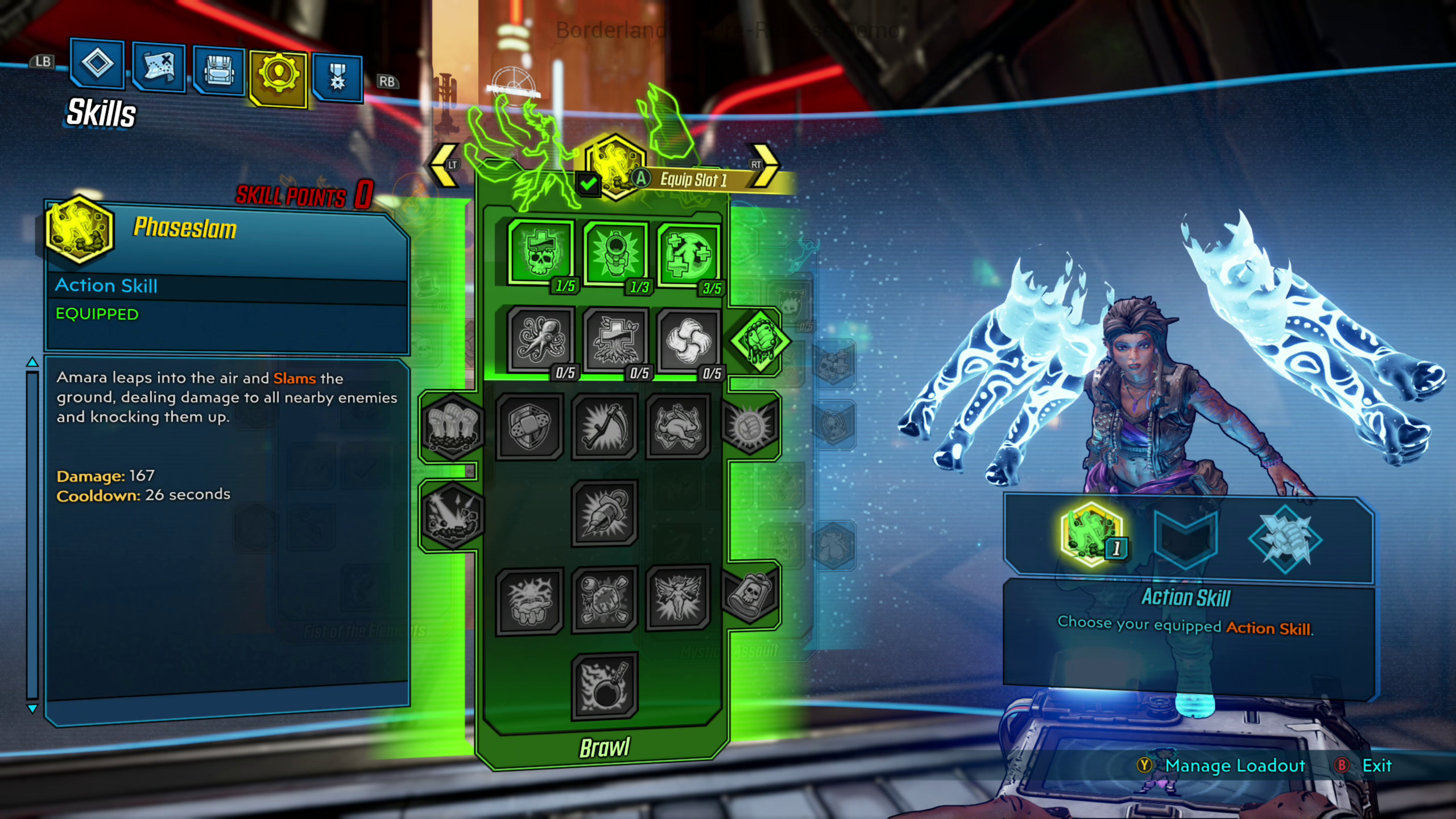Amara is the new Siren character of Borderlands 3, and her skill tree has three branches: Mystical Assault, Brawl, and Fist of the Elements. Each tree comes with one equippable Action Skill, which is a special Siren power Amara can use against enemies. These can be further modified with various Augments in that particular skill tree, so ‘Blight Tiger’ adds a toxic element to her Phaseslam Action Skill. There are even different versions of that Action Skill to upgrade to as you unlock Amara’s later ability tiers. Other unlockable skills merely boost her general skills, but are still just as useful.
