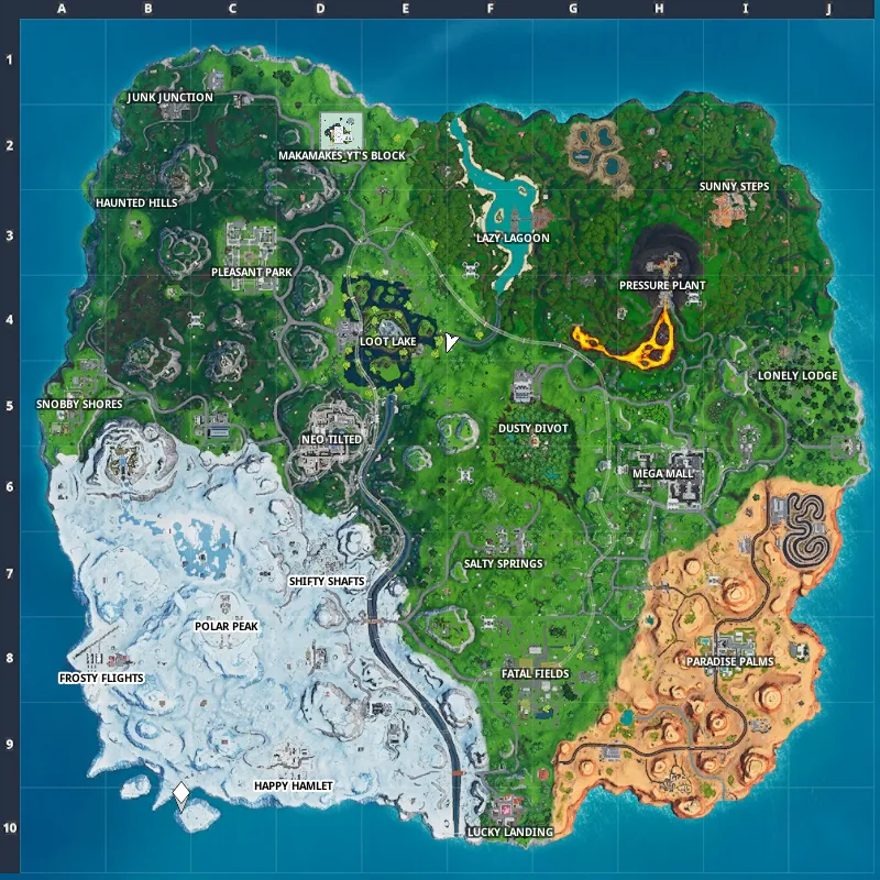The deadly volcano that destroyed Tilted Towers and Retail Row is now nothing more than a charred crater. That’s not to say that the space has gone to waste, though! The Pressure Plant has been constructed in a crevice. There’s still a bit of lava streaming out the front, so make sure you don’t get burned!