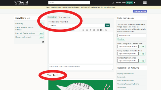 To connect with others you know, use those same invite links mentioned above. When you’re no longer on the waiting list, the share links can easily be found on the right-hand side of the “Your Feed” home page. Depending on which link you give to someone, they will become your official Friend (and you’ll follow each other), and they’ll be added to either your colleagues, family members, or friends circles. You can also create custom invitations with the “Name your group” field above the other invitation links. Using this tool allows you to choose a SubWiki for the people who use that link to automatically join when they create a WT.Social account.