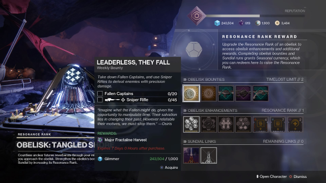 Resonance Rank-ups also allow you to unlock additional Obelisk bounties. Weekly Obelisk bounties contain standard bounty objectives, such as killing 20 Fallen captains and killing 45 enemies with precision sniper damage. Obelisk bounties provide Polarized Fractaline when completed.