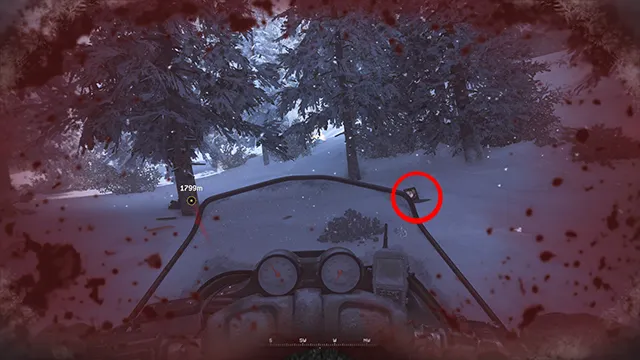 After jacking the snowmobile at the end, you’ll come across two paths at around the 1,800 meter mark. Instead of going down either path, slowly go through the middle. You’ll see the intel on the ground. Just drive over it to pick it up.