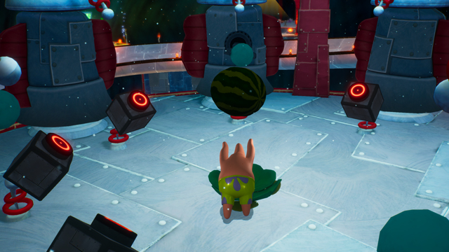 In order to beat the Spinning Towers of Power puzzle, players must throw the fruit in the center of the generators at the switches which rotate them.