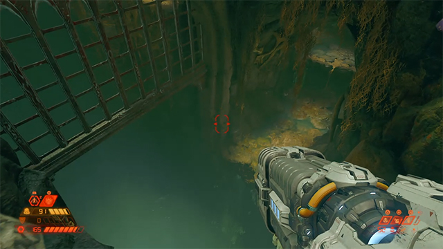 Once you kill the Marauder, you will eventually have to get an elevator. Once you take it up, step out and look to your right. Don’t just across quite yet to the Arachnotron.