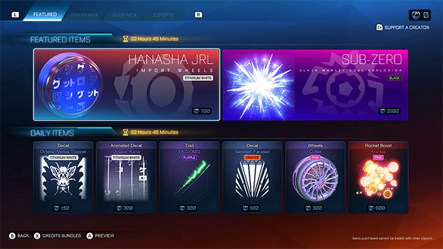 Players can get the Hanasha JRL wheels in Rocket League through the item shop. These wheels seem to rotate in every once in a while as the shop updates every day. There are also 14 different colors that the wheels come in. The titanium white Hanasha JRL wheels were in the shop on March 15 (and will leave on noon PST on March 16). The lime variant was in the shop on February 21, 2021. The lime wheels were 600 credits and the titanium white wheels were 700 credits, meaning that there is a credit disparity between colors, despite fundamentally being the same wheels. These colors are: