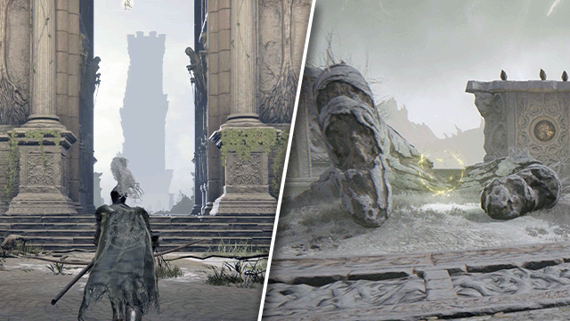 Past the Site of Grace is a bridge. Unfortunately, there are three giant Guardian Golems here that want to crush the player. The best thing to do here is to run as quickly as possible to the end of the bridge. There are columns that players can use to block the arrows that the third golem shoots, which is great because they hit hard. At the end of the bridge is a portal that will teleport players to the Divine Tower of Limgrave. Players should hit it as quickly as possible and they’ll arrive at their destination.