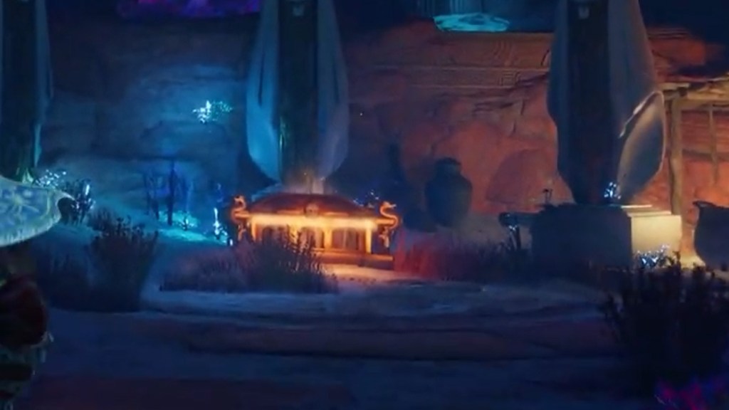 Location: You’ll find this chest in the Barrens on one of the rock mesas jutting out of the group. This one, in particular, has some elven ruins and three nest vines on it. Go to the north side of the mesa and throw your ax through the three vines to open the path to the chest.