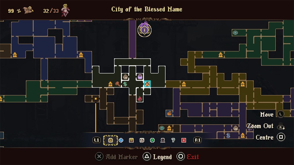 The fourth cursed letter is about finding a “skull” that “scrutinizes all with its last living eye like a grim cyclops.” The player must then pass “under it twice more.” This is one of the ones that’s hardest to spot since it is so small. Go to the City of the Blessed Name and go to the shop, as seen in the above map. Walk back and forth across the shop’s entrance a few times (but don’t go in). The game should stop you after a few runs and you should have the final letter.