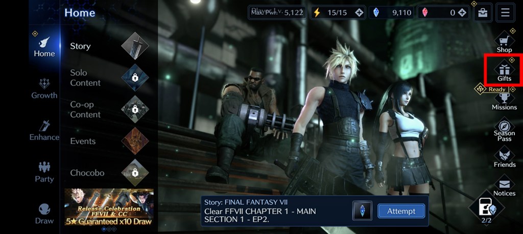 To get your Blue Crystals to unlock in Final Fantasy: Ever Crisis, you have to claim them. In order to claim your Blue Crystals, go to your Gift Box. The Gift Box icon is right under the stop on the right side of the screen. It will likely have a little notification icon if you have something in there.