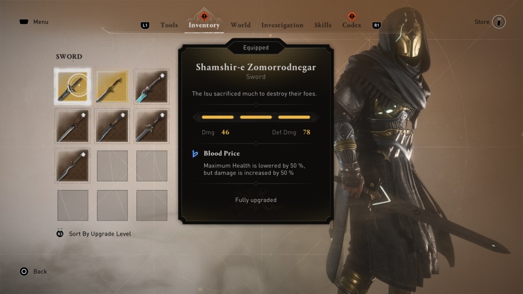 Trading in three shards unlocks the Shamshir-e Zomorrodnegar, which is named after the Persian mythical sword. It is already fully leveled up and increases the damage you deal by 50% but also caps your health at 50%.