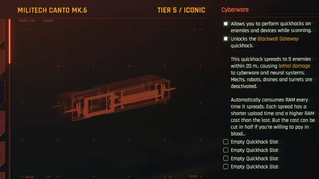 The Militech Cando MK.6 is the only cyberdeck in Cyberpunk 2077 with the Tier 5 Iconic Blackwall Gateway quickhack. Unfortunately, the deck itself isn’t that great. It only has four quickhack slots, and endgame netrunners will find the slow upload speed of Blackwall Gateway impedes its usefulness.