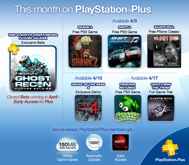 April is packed to the gills with goodies for PlayStation Plus subscribers. First and foremost is early access to the Ghost Recon Future Soldier beta for Plus members. The date for the beta hasn't been locked down yet, but with Ubisoft's third-person military shooter releasing in May, it's gotta happen some time soon.