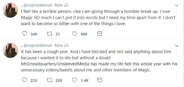 The subreddit’s moderators attempted to prevent the more incendiary comments from breaking through the woodwork by way of banning users posting personal attacks against the cosplayer, though it seems that Sprankle’s mentioning of harassment inadvertently led to her receiving more harassment, causing her to take to Twitter and address the community, specifically naming Unsleeved Media as being the main source of making her life “hell” with his “unnecessary videos/tweets about me and other members of Magic.