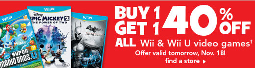 Toys "R" Us just sent out an e-mail to customers detailing a hot offer that starts tomorrow. All Wii & Wii U games are going to be available with a "buy 1, get 1" 40% offer. That means you can walk out of the store with New Super Mario Bros. U and ZombiU for $96 plus tax. The only catch is the offer is only available in-store.