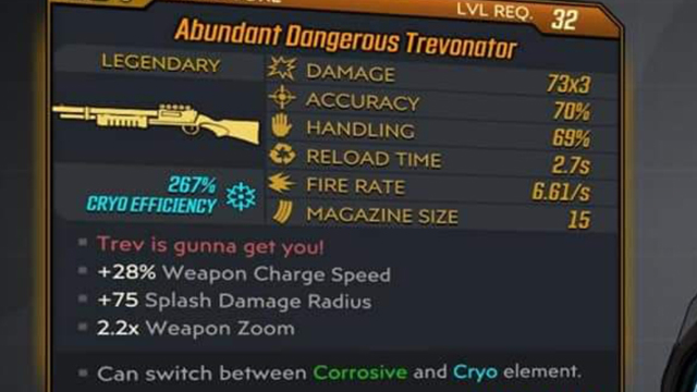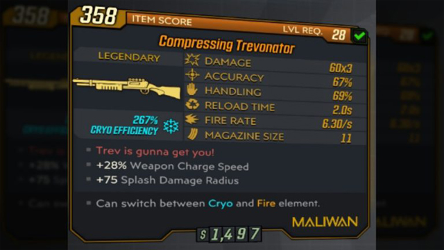 Not only that, but in the final version of the game, Gearbox is also said to have included an exclusive skin for the Compressing Trevonator Legendary weapon. The “Abundant Dangerous Trevonator” skin, which features Eastman’s Reddit screen name emblazoned on the gun, can be seen alongside the relevant stats below.