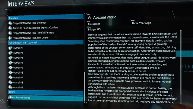 Death Stranding has been criticized for its depiction of asexuality, with the game calling it a popular “sexless lifestyle” and suggesting that it’s responsible for a dramatic decline in its world’s birth rate. The comments are made in an interview log titled ‘An Asexual World,’ which discusses the “increasing popularity” of asexuality among young people.