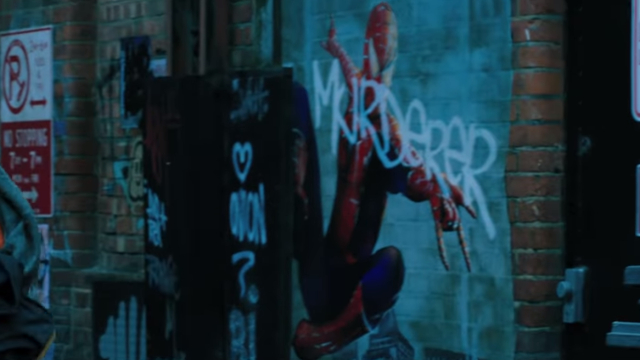 At the 2:10 mark in the Morbius trailer, you can see graffiti of Spider-Man painted on the wall to the right of Jared Leto. However, this artwork wasn’t explicitly made for this footage. Instead, it seems like this art was taken from one of the PR shots for Spider-Man PS4. As you can see, the two Spideys are identical, with the graffiti just being the Spider-Man PS4 art flipped horizontally.