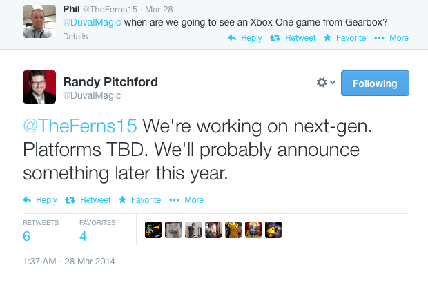 Gearbox Software's Randy Pitchford has confirmed that the folks over at his studio are currently working on something for next-gen hardware, hinting at the possibility that we may hear more about it later this year.