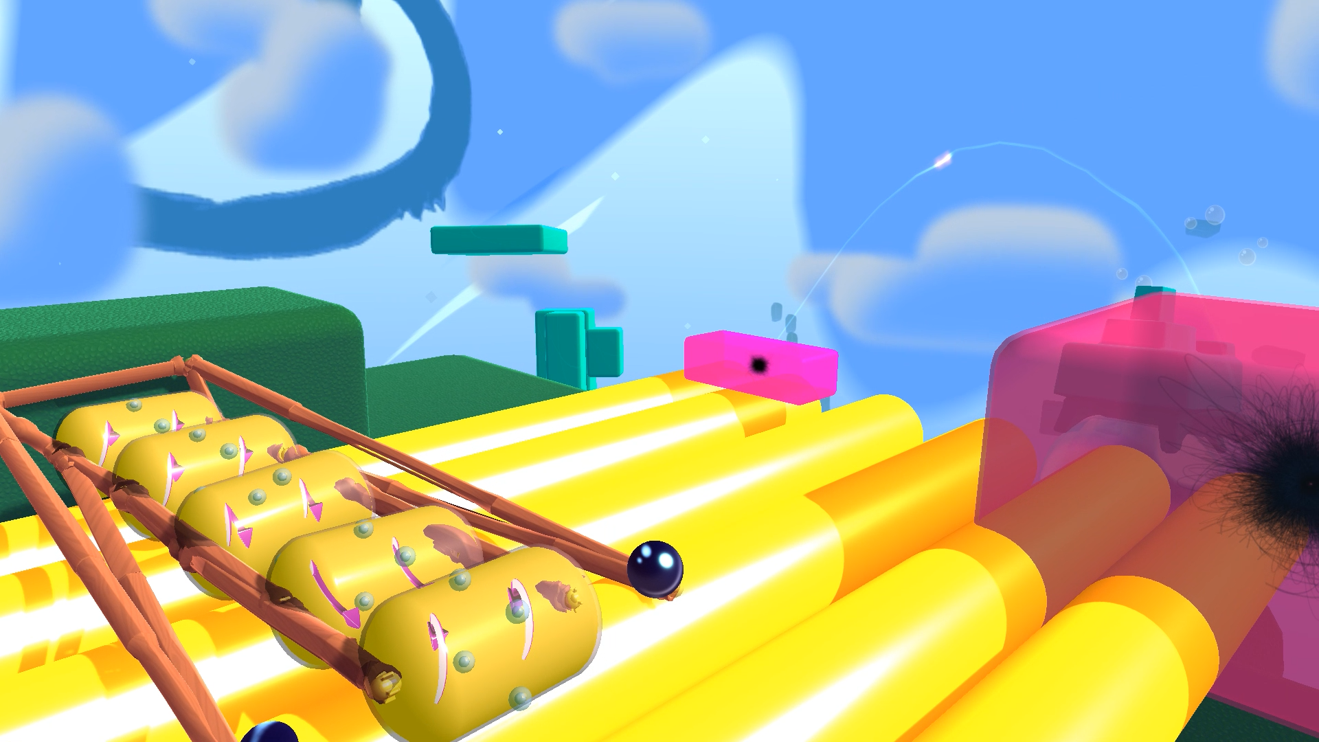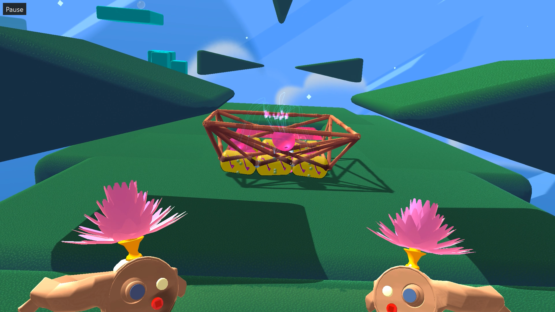 I started by pulling wood balloons out of the cat and stretching them with my hands before connecting them together, taking a workman-like pace as I tried to build a small upright bridge that would fall and land across the gap between the platforms in front of me. This would allow a small car I was making—with the pink balloon attached—to drive across it and reach the goal. After working for several minutes, the developers from Northway Games and Radial Games—who are collaborating on the project—gave me a few hints, telling me about a joint that was next to my right ear that would make the connection points stiff instead of floppy. I reached up with my right hand and pulled a trigger on the Oculus Touch controller and came back with a black orb that I used to fuse my Tinker Toy-like bridge's legs together.