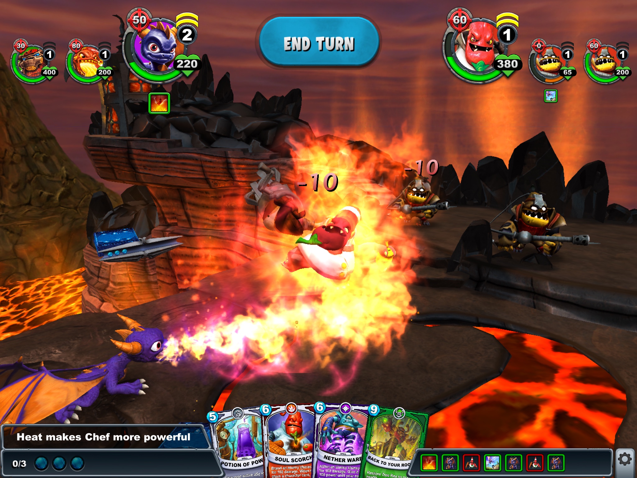 Battles are turn-based, rendered in 3D, with a single Skylander taking the front position for combat and defense that can be swapped out. Duong suggested balancing the party with a tank to soak up damage, an attacker, and a healer. When attacking, it's a classic turn-based battle, with the 3D characters' attacks being animated, with 3D-rendered backgrounds, instead of classic 2D cards sitting on a digital table.