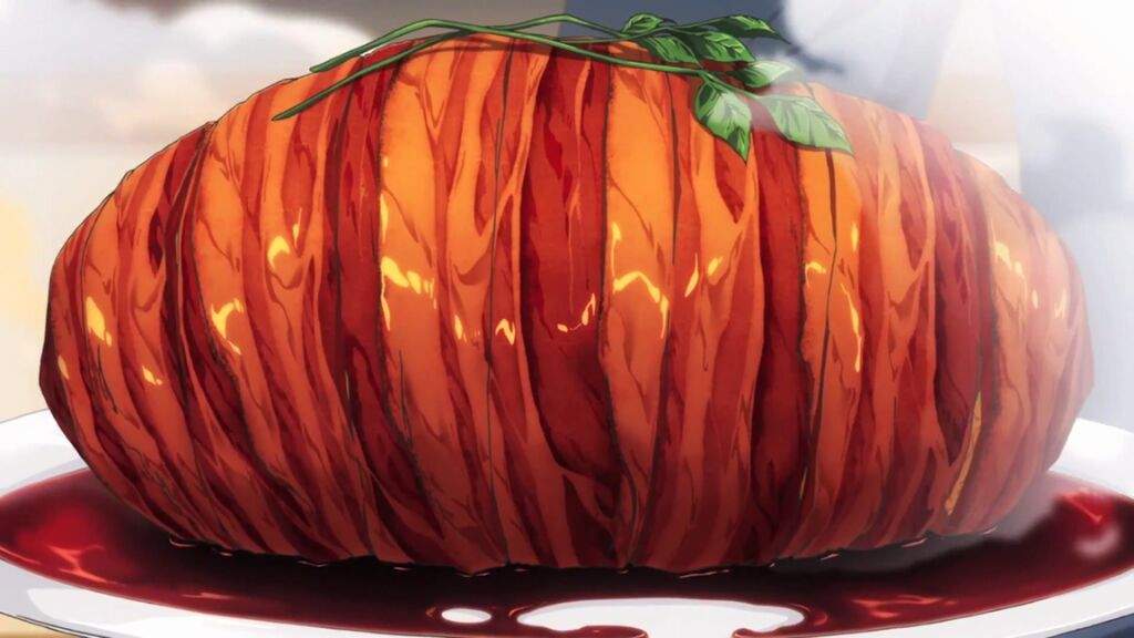 While the agent gets her lackeys to do her dirty work by sabotaging Soma, it’s all for naught. He crafts a delicious bacon and potato dish that imitates roast pork, and the reception is explosive. The show pulls no punches in showing how delicious his adversaries find the food. There are simulated orgasms cleverly depicted by rivers of sauce and characters bursting out of their clothes from pleasure. This effectively set the tone for the rest of the series.