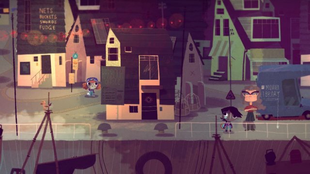 The world of Knights and Bikes uses its hand-drawn graphics to render the island through the eyes of a child. You and a friend can take control of Nessa and Demelza as they explore familiar areas that are distorted by the lens of youthful imagination. The perspectives of buildings are disproportionate, as a child rarely has any real sense of scale.