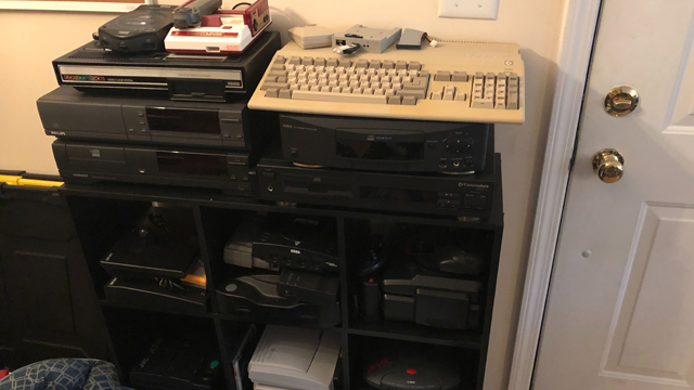 Jason Faulkner, senior editor: “My main setup is a tangled mess since I’m constantly rearranging and have more stuff than space. I have a shelf for the high-dollar retro stuff that I try and keep real neat and tidy. Unfortunately, a lot of my games for older systems are in storage, because I no longer have room for more shelves. Right now I have a PC, PS4 Pro, Xbox One, and Switch running through a Denon S730H AV receiver. For retro stuff, I have a Wii, Sony SL-HF2000 Betamax player, Sony SLV-R1000 VHS player, and Pioneer CLD-D704 laserdisc player, all running through a Panasonic DMR-ES25 DVD recorder which I then run through a Framemeister X-RGB mini for upscaling. The computer in the front (obscured by the period-appropriate Microsoft Comfort Keyboard) is my latest project and is a Pentium 3, Win 98 machine running through an OSSC which is just about where I want it.