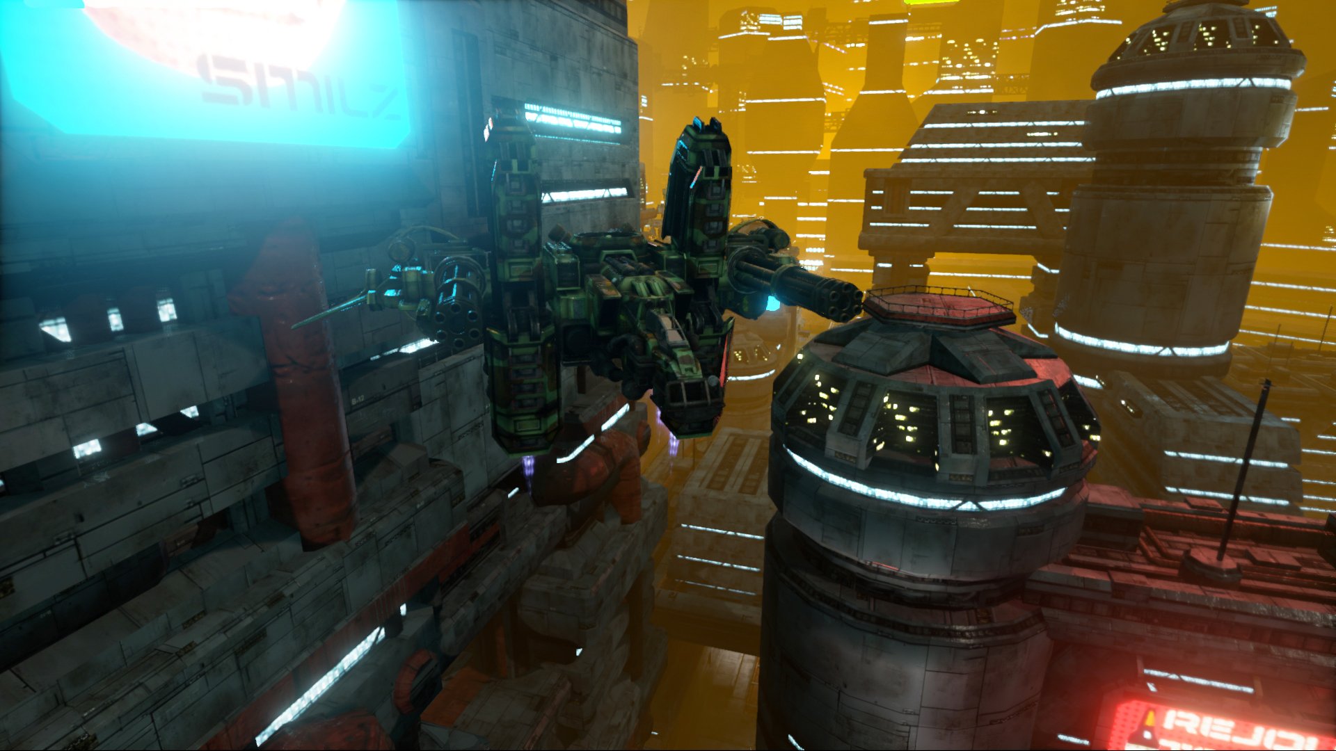 Strike Vector EX is Macross meets French sci-fi comics meets Armored Core. Some of you heathens may know Macross by its bastard name, Robotech; I forgive you because I love you in the way only a brain fogged by sickness can. What I mean is that you are in a mech that looks vaguely like it could be from a Japanese animated show, if it had all the pipes and electronics that should be on the inside, on the outside. Like they built the mech and forgot to put a hood on it. It makes stuff blow up good.